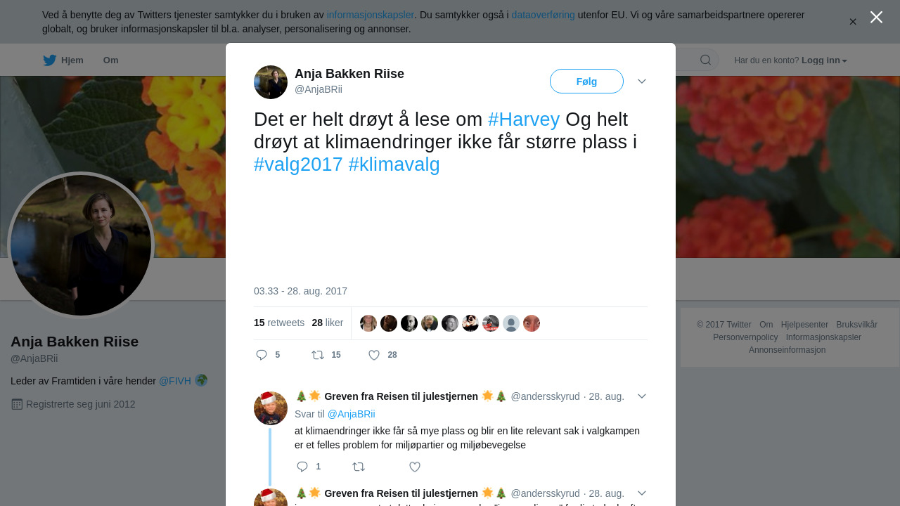 RT @AnjaBRii: Det er helt drøyt å lese om #Harvey Og helt drøyt at klimaendringer ikke får større plass i #valg2017 #klimavalg https://t.co/mMtzviV7Io