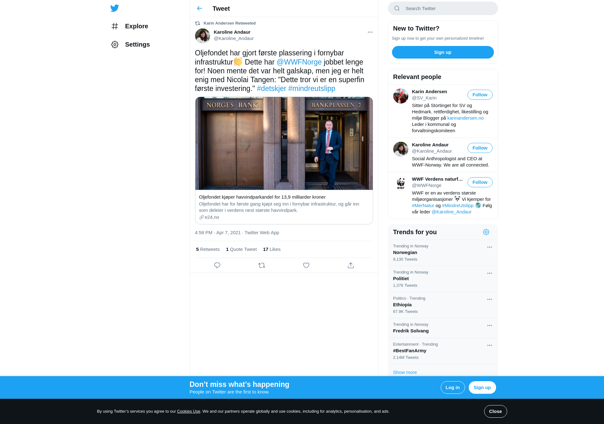 RT @Karoline_Andaur: Oljefondet har gjort første plassering i fornybar infrastruktur👏 Dette har @WWFNorge jobbet lenge for! Noen mente det var helt galskap, men jeg er helt enig med Nicolai Tangen: "Dette tror vi er en superfin første investering." #detskjer #mindreutslipp https://t.co/gJYdpVLOUW