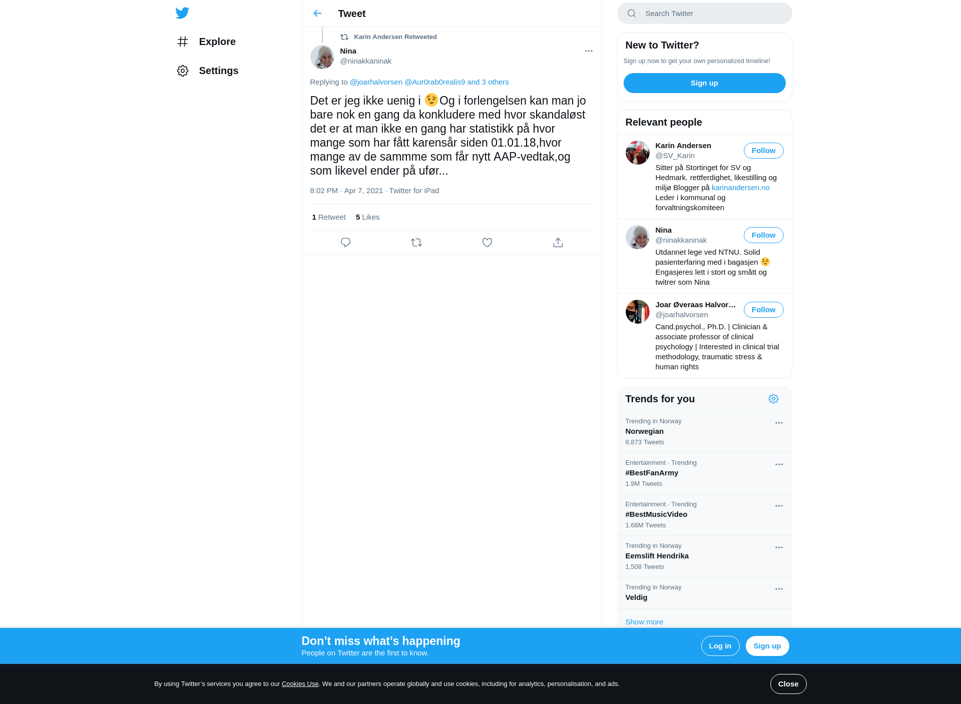 RT @ninakkaninak: @joarhalvorsen @Aur0rab0realis9 @SV_Karin @SVparti @Dagsavisen Det er jeg ikke uenig i 😉Og i forlengelsen kan man jo bare nok en gang da konkludere med hvor skandaløst det er at man ikke en gang har statistikk på hvor mange som har fått karensår siden 01.01.18,hvor mange av de sammme som får nytt AAP-vedtak,og som likevel ender på ufør...