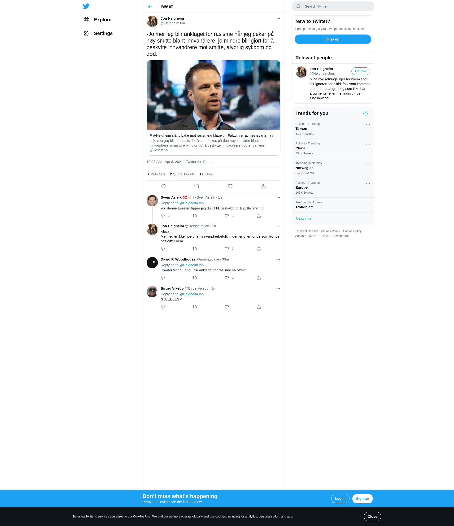 – Jo mer jeg blir kalt rasist for å sette fokus på den høye smitten blant innvandrere, jo mindre blir gjort for å beskytte innvandrere - og enda flere innvandrere vil rammes av alvorlig sykdom og i verste fall død. Stortingsrepresentant Jon Helgheim har fått mye kritikk etter at han i påsken spur