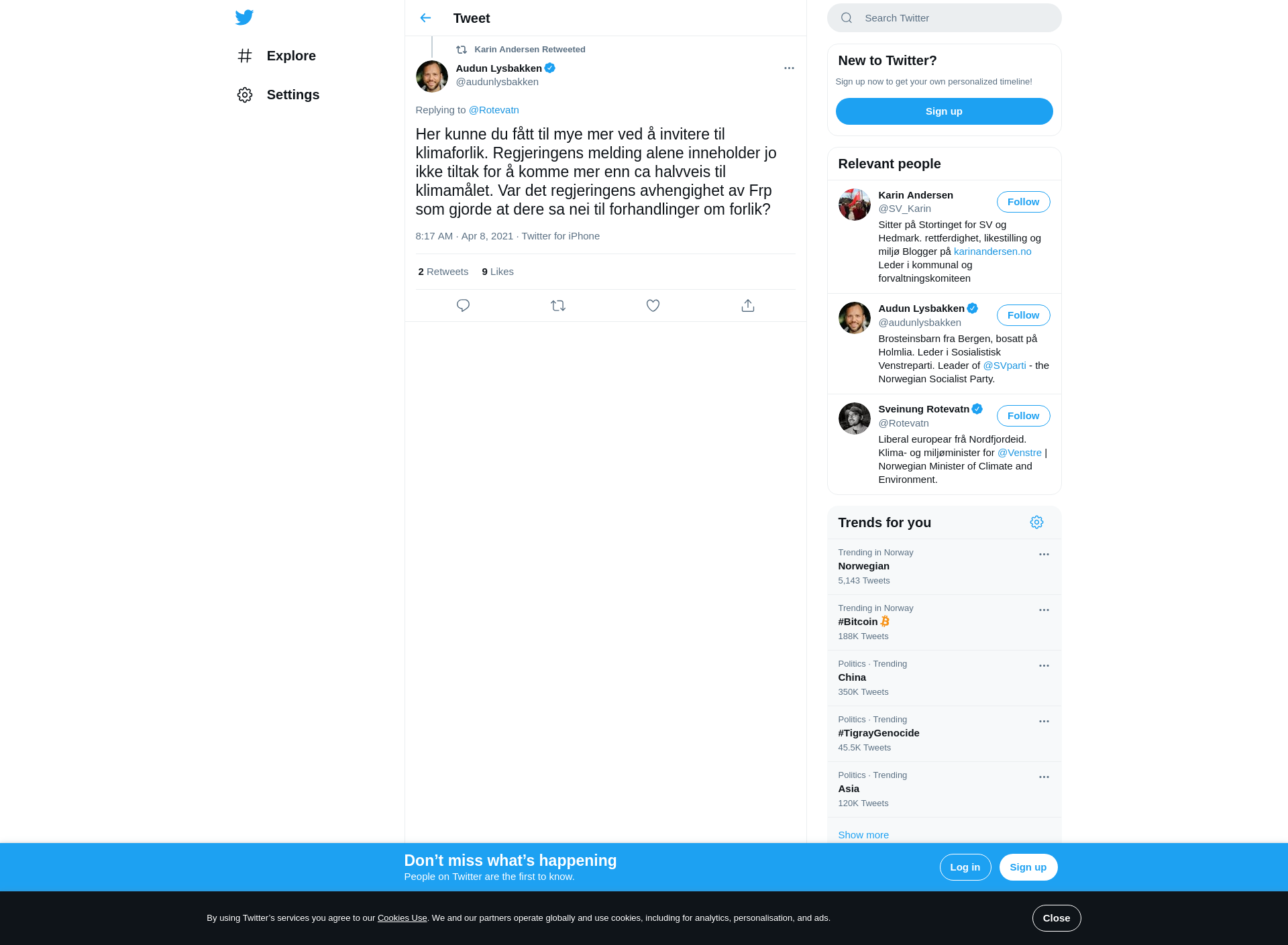 RT @audunlysbakken: @Rotevatn Her kunne du fått til mye mer ved å invitere til klimaforlik. Regjeringens melding alene inneholder jo ikke tiltak for å komme mer enn ca halvveis til klimamålet. Var det regjeringens avhengighet av Frp som gjorde at dere sa nei til forhandlinger om forlik?