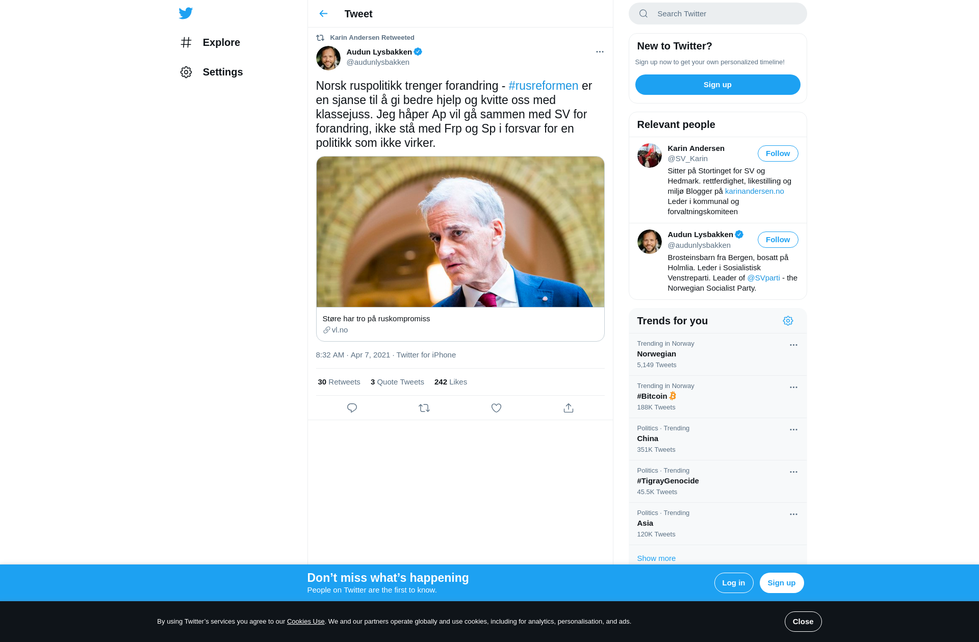 RT @audunlysbakken: Norsk ruspolitikk trenger forandring - #rusreformen er en sjanse til å gi bedre hjelp og kvitte oss med klassejuss. Jeg håper Ap vil gå sammen med SV for forandring, ikke stå med Frp og Sp i forsvar for en politikk som ikke virker. https://t.co/v5owmitZOR