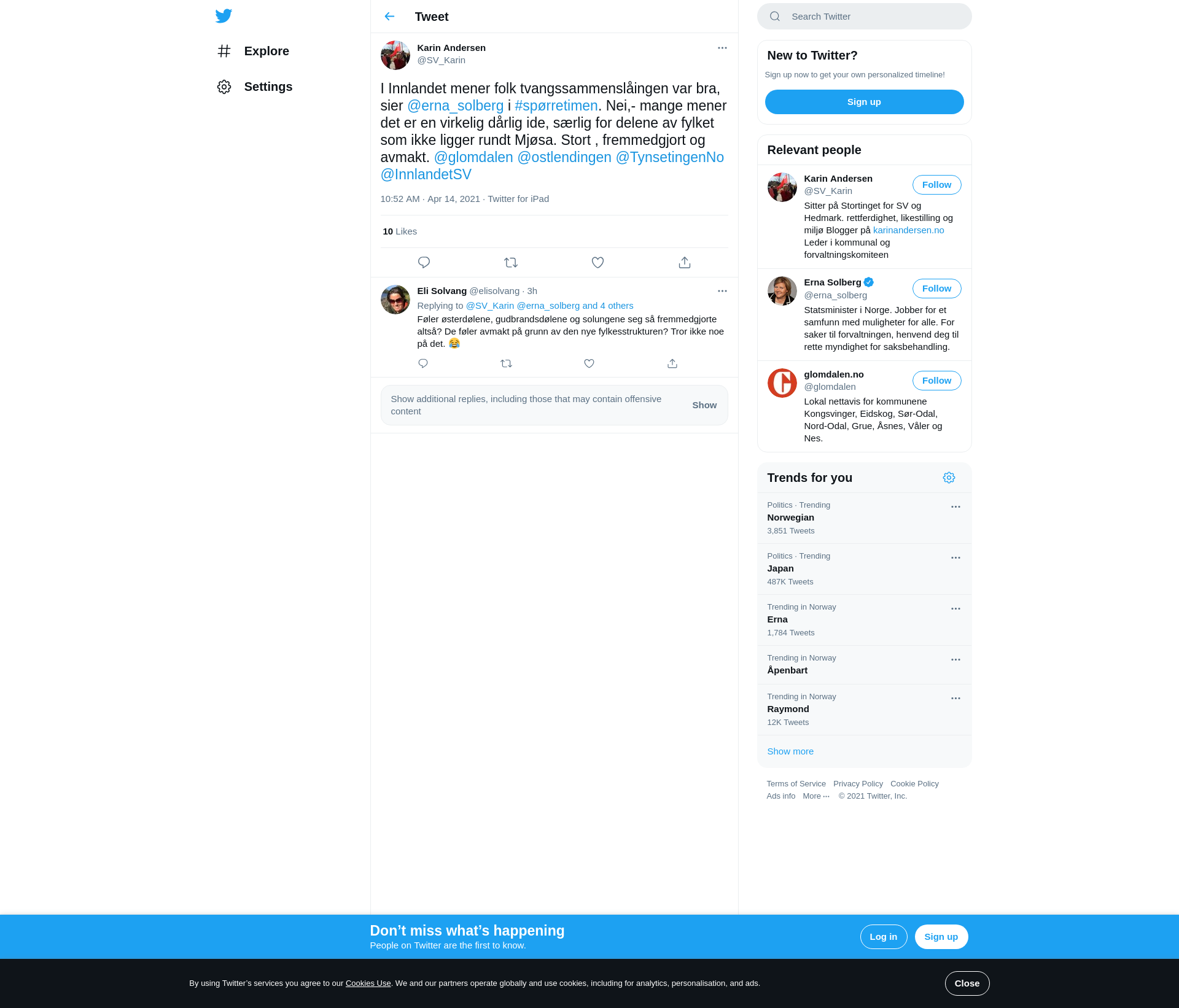 I Innlandet mener folk tvangssammenslåingen var bra, sier @erna_solberg i #spørretimen. Nei,- mange mener det er en virkelig dårlig ide, særlig for delene av fylket som ikke ligger rundt Mjøsa. Stort , fremmedgjort og avmakt. @glomdalen @ostlendingen @TynsetingenNo @InnlandetSV
