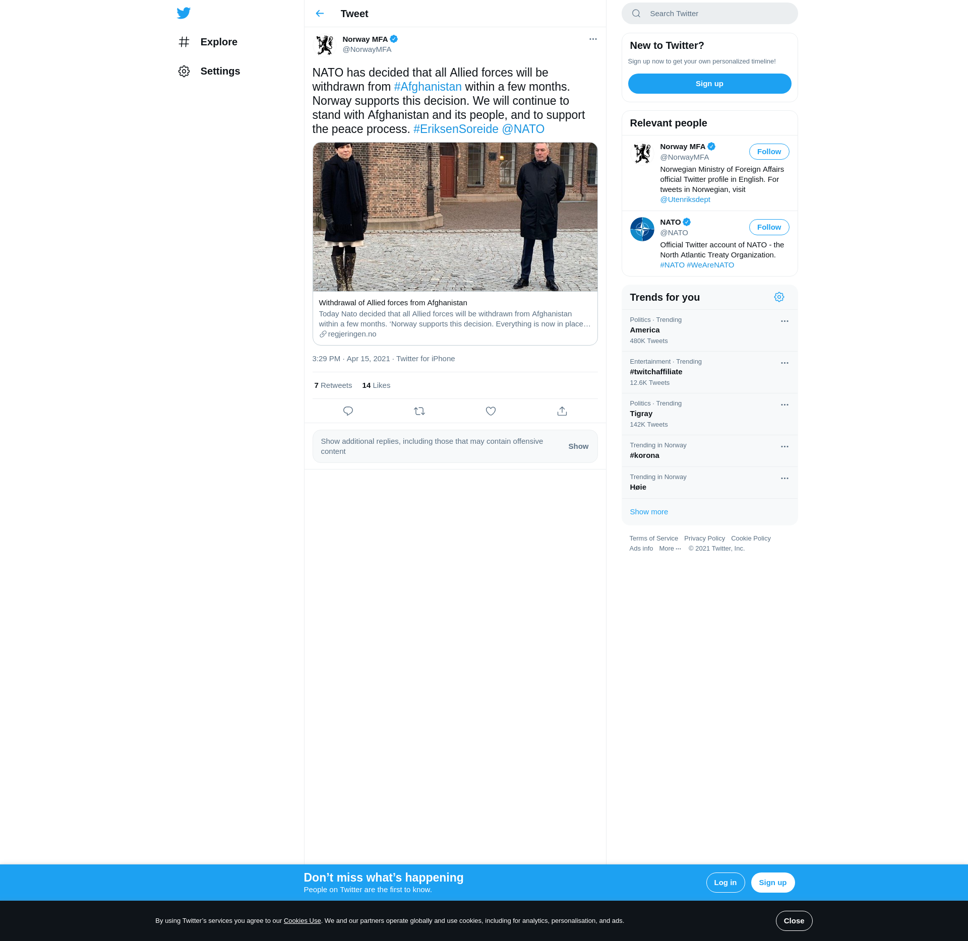 Today Nato decided that all Allied forces will be withdrawn from Afghanistan within a few months. ‘Norway supports this decision. Everything is now in place for a coordinated, orderly and deliberate drawdown. We will continue to stand with Afghanistan ...