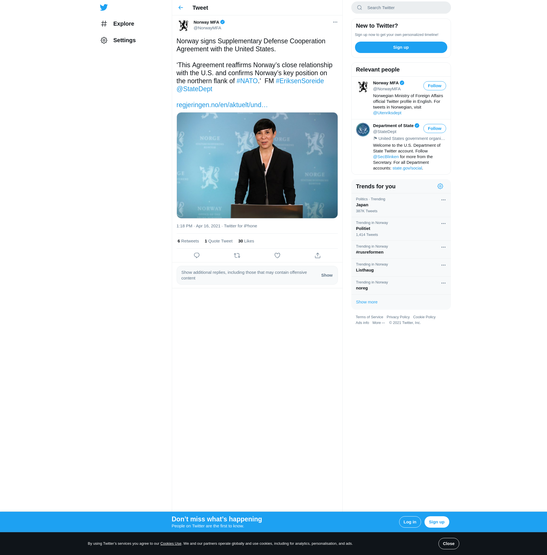"The United States of America is Norway’s most important ally, and we have shared more than 70 years of close, constructive defence cooperation. The Agreement both updates and further develops the agreements and cooperation already in place between Nor...