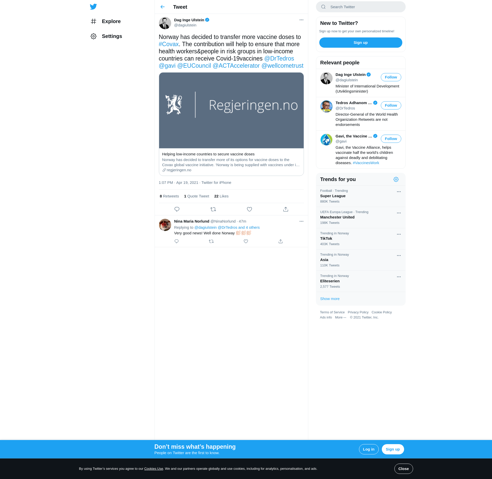 Norway has decided to transfer more of its options for vaccine doses to the Covax global vaccine initiative. ‘Norway is being supplied with vaccines under its agreement with the EU and has decided that these options are not relevant for use on the Norw...