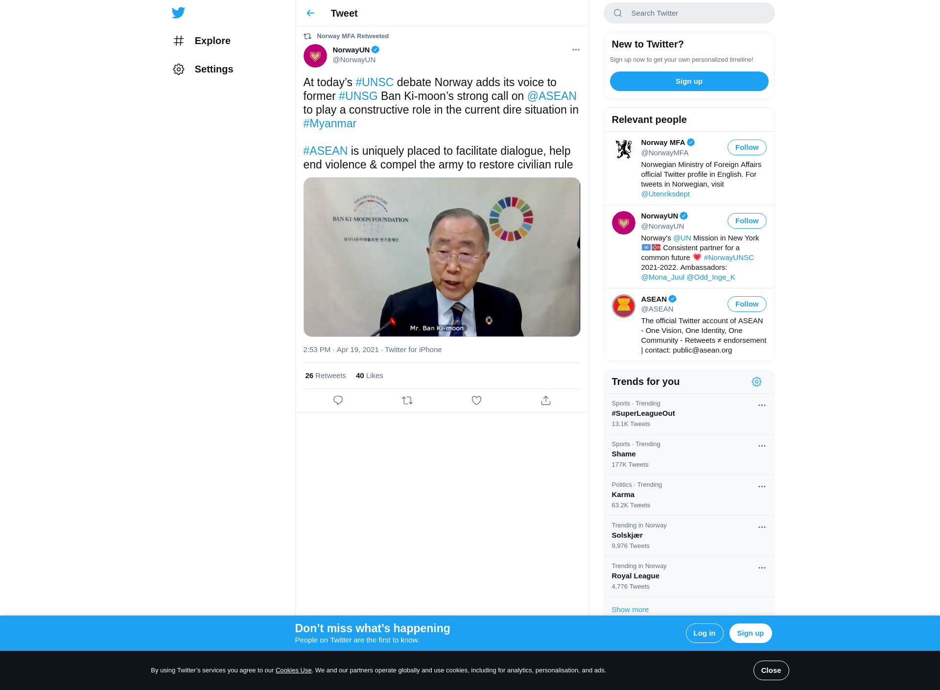 RT @NorwayUN: At today’s #UNSC debate Norway adds its voice to former #UNSG Ban Ki-moon’s strong call on @ASEAN to play a constructive role in the current dire situation in #Myanmar