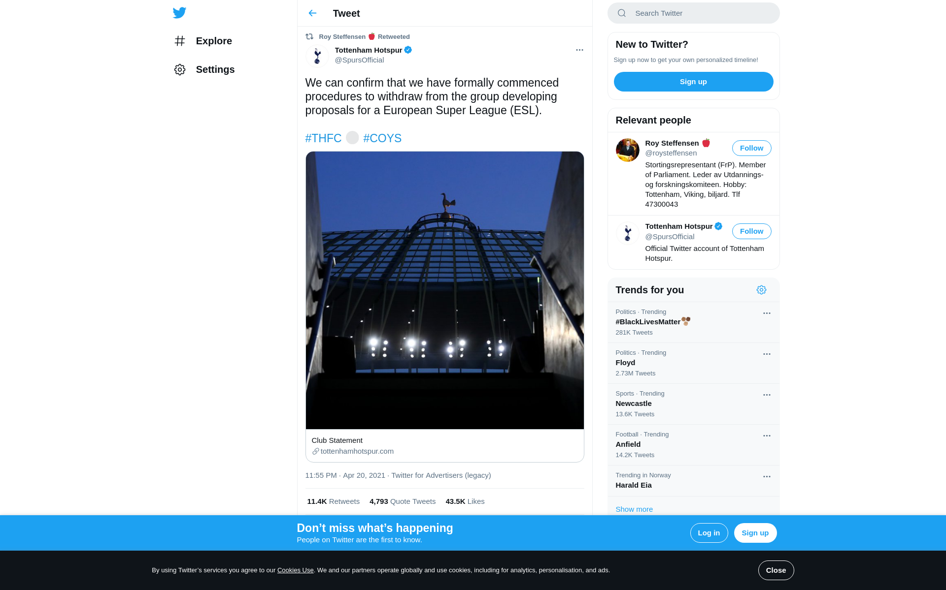 RT @SpursOfficial: We can confirm that we have formally commenced procedures to withdraw from the group developing proposals for a European Super League (ESL). #THFC ⚪️ #COYS
