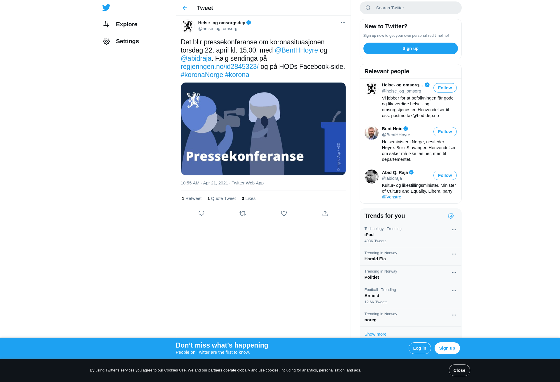 Invitasjon til pressekonferanse torsdag 22. april kl. 15:00 med helse- og omsorgsminister Bent Høie og kultur- og likestillingsminister Abid Raja. Helsedirektør Bjørn Guldvog frå Helsedirektoratet og avdelingsdirektør Line Vold frå Folkehelseinstitutte...