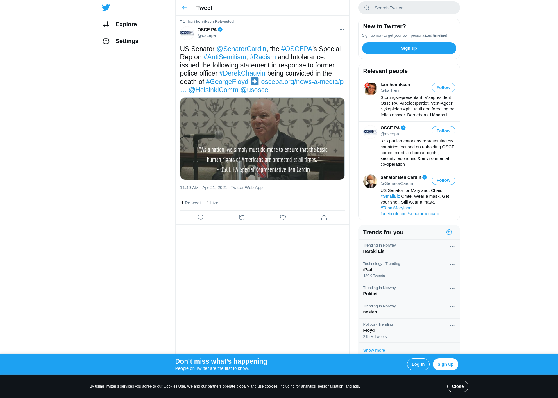 RT @oscepa: US Senator @SenatorCardin, the #OSCEPA’s Special Rep on #AntiSemitism, #Racism and Intolerance, issued the following statement in response to former police officer #DerekChauvin being convicted in the death of #GeorgeFloyd ➡️ https://t.co/M9qZlfI25o @HelsinkiComm @usosce https://t.co/cdX8nlvpox