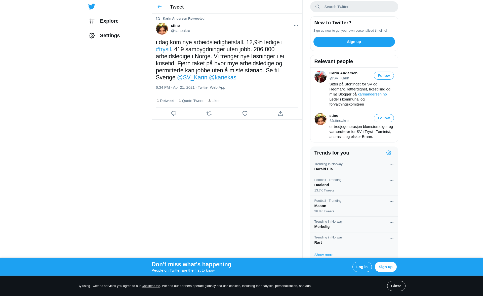 RT @stineakre: i dag kom nye arbeidsledighetstall. 12,9% ledige i #trysil. 419 sambygdninger uten jobb. 206 000 arbeidsledige i Norge. Vi trenger nye løsninger i ei krisetid. Fjern taket på hvor mye arbeidsledige og permitterte kan jobbe uten å miste stønad. Se til Sverige @SV_Karin @kariekas