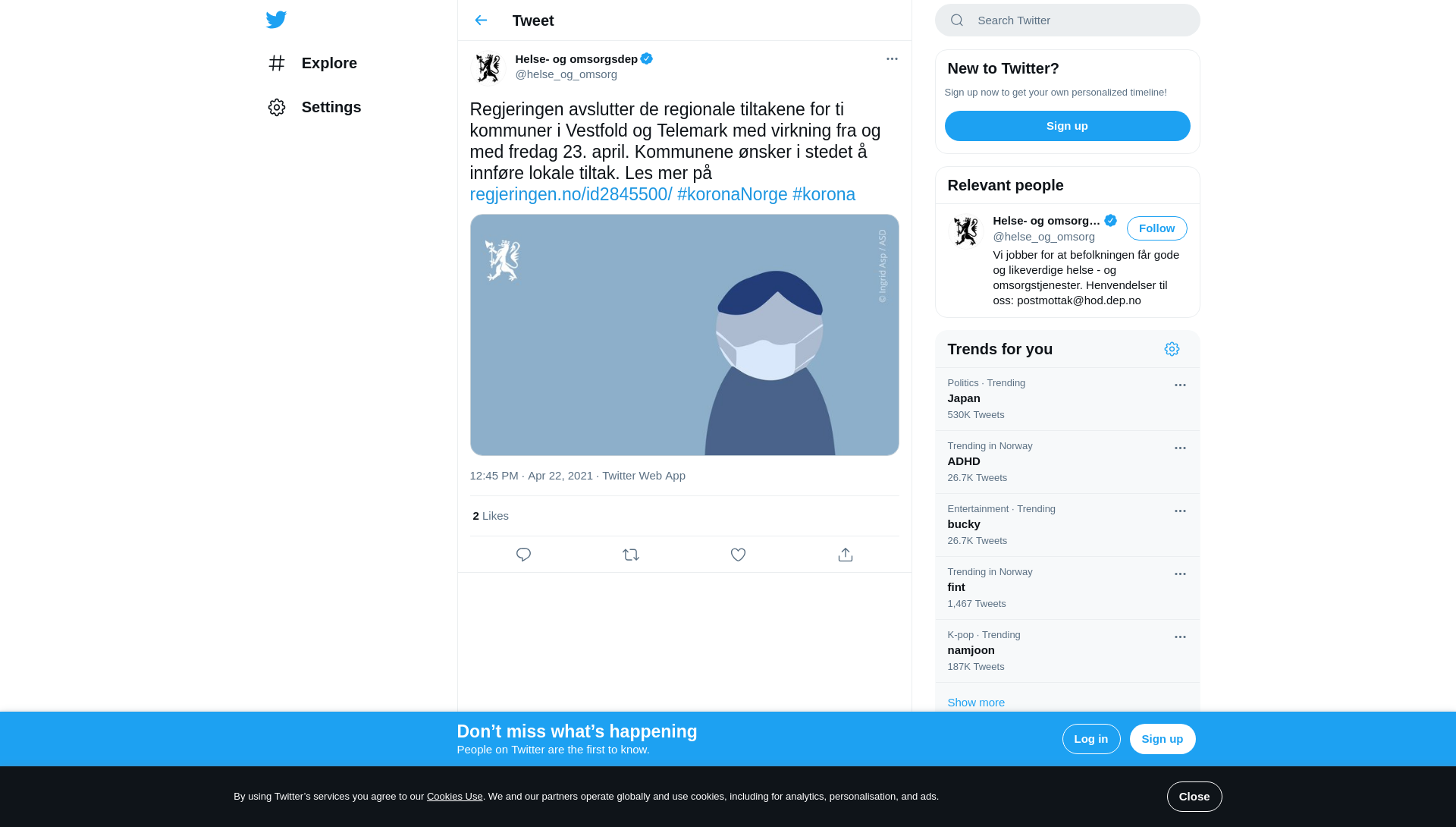 Etter anbefalinger fra Helsedirektoratet, Folkehelseinstituttet og statsforvalter avslutter regjeringen de regionale tiltakene for ti kommuner i Vestfold og Telemark med virkning fra og med fredag 23. april. Kommunene ønsker i stedet å innføre lokale t...