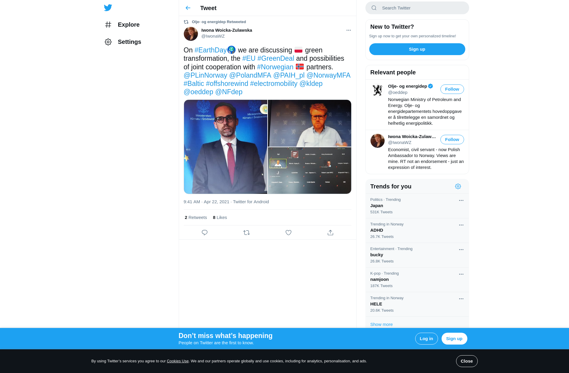 RT @IwonaWZ: On #EarthDay we are discussing 🇵🇱 green transformation, the #EU #GreenDeal and possibilities of joint cooperation with #Norwegian 🇳🇴 partners. @PLinNorway @PolandMFA @PAIH_pl @NorwayMFA #Baltic #offshorewind #electromobility @kldep @oeddep @NFdep https://t.co/6TE9fPmEZI