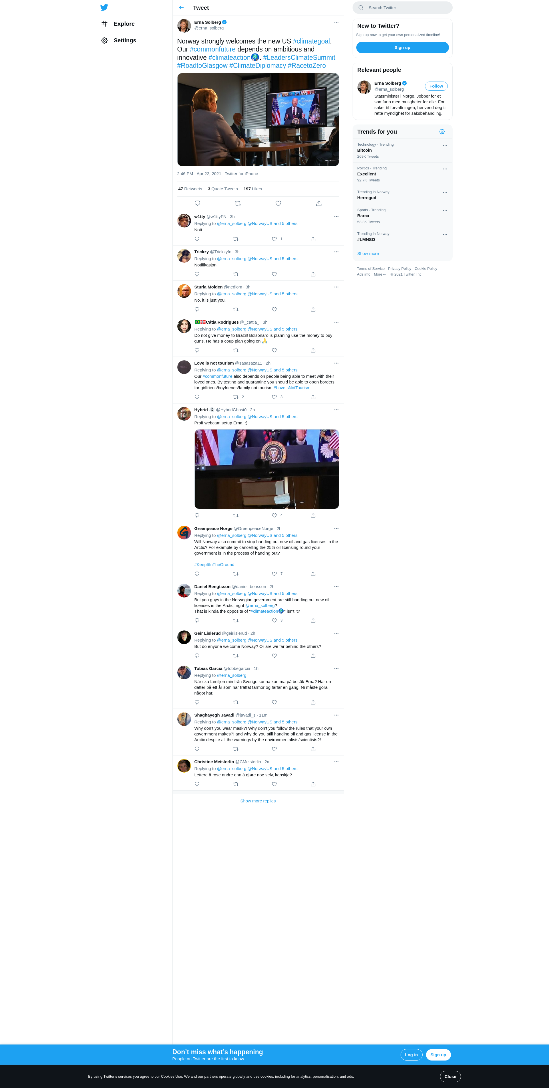 Norway strongly welcomes the new US #climategoal. Our #commonfuture depends on ambitious and innovative #climateaction. #LeadersClimateSummit #RoadtoGlasgow #ClimateDiplomacy #RacetoZero https://t.co/WiOTRuxjmE