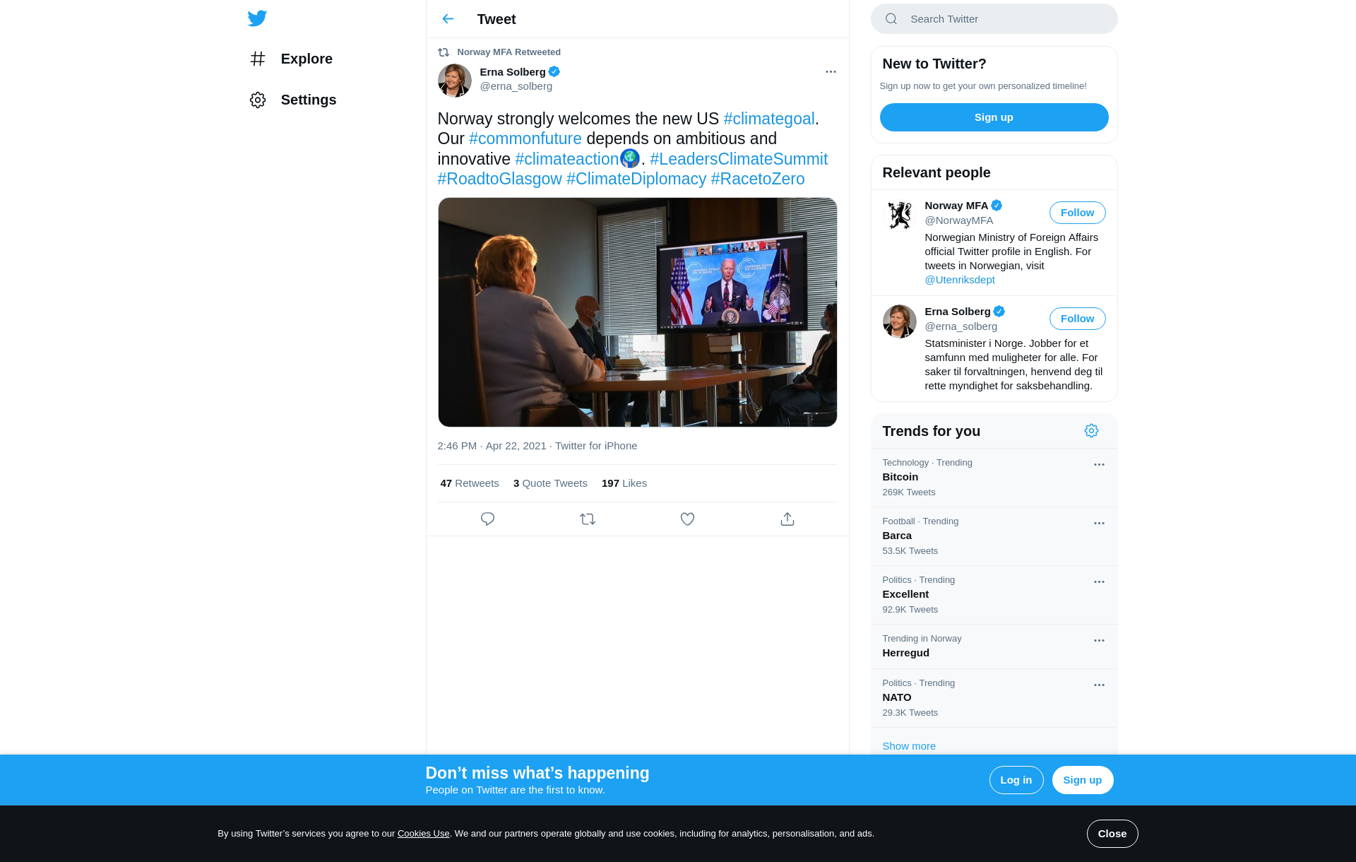 RT @erna_solberg: Norway strongly welcomes the new US #climategoal. Our #commonfuture depends on ambitious and innovative #climateaction. #LeadersClimateSummit #RoadtoGlasgow #ClimateDiplomacy #RacetoZero https://t.co/WiOTRuxjmE