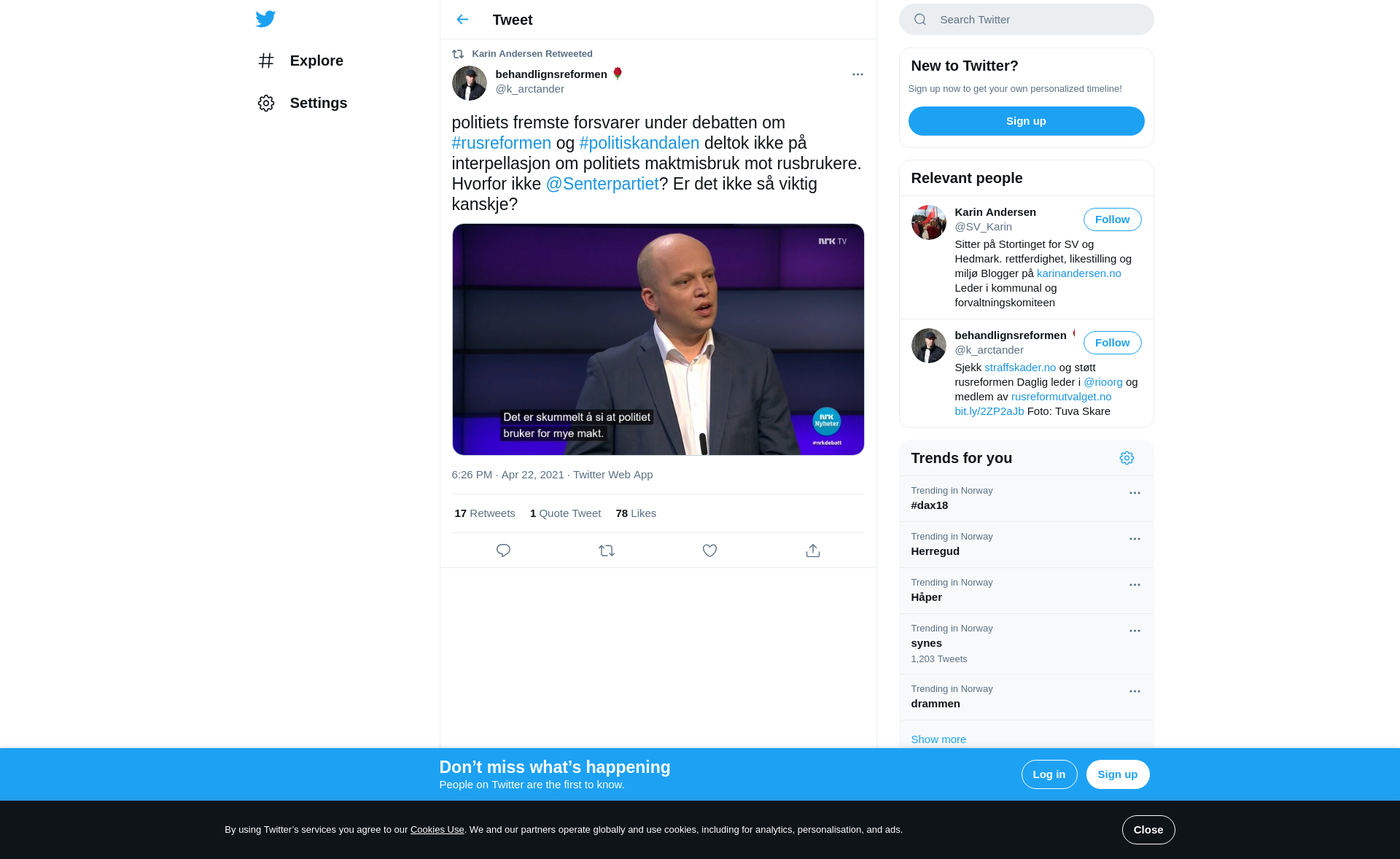 RT @k_arctander: politiets fremste forsvarer under debatten om #rusreformen og #politiskandalen deltok ikke på interpellasjon om politiets maktmisbruk mot rusbrukere. Hvorfor ikke @Senterpartiet? Er det ikke så viktig kanskje? https://t.co/CA60Y04iwr