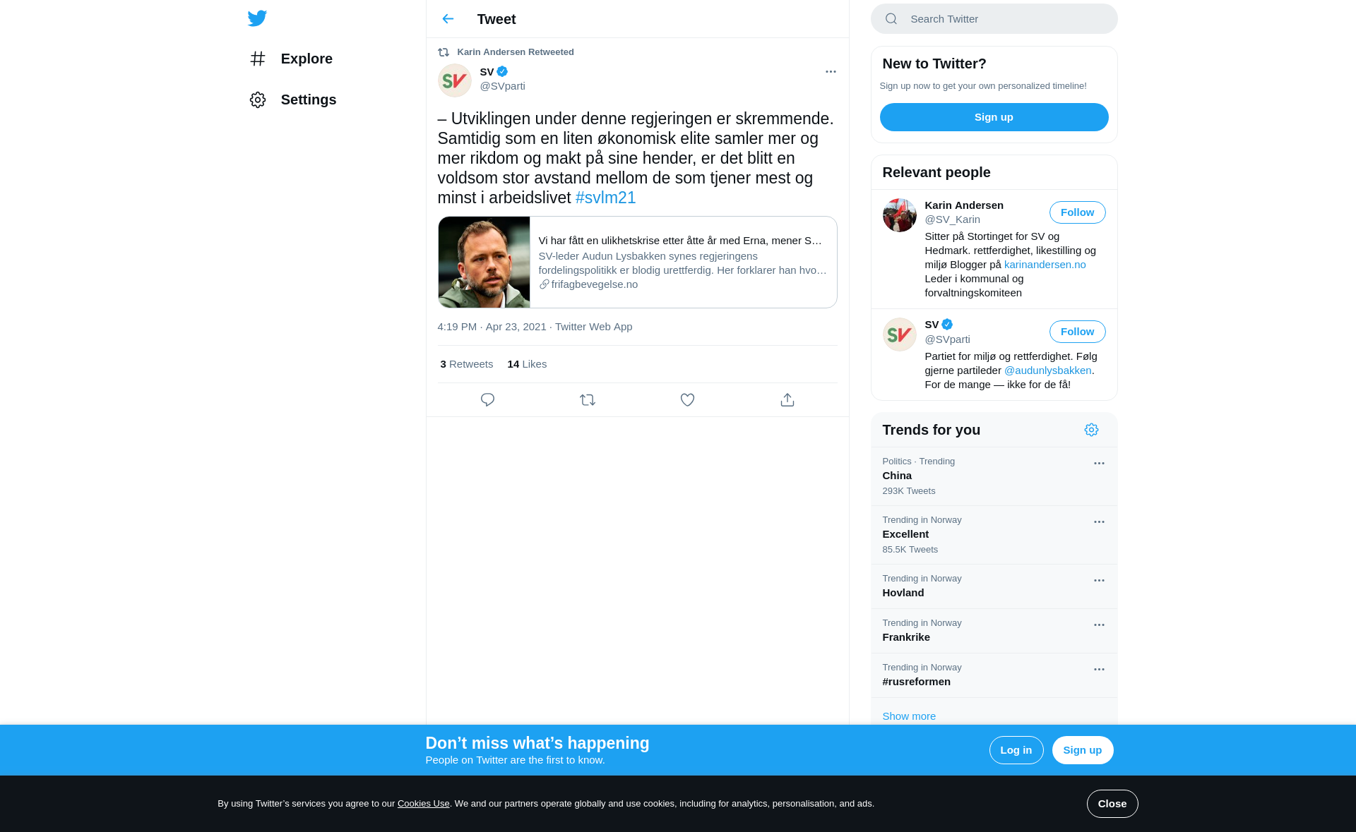 RT @SVparti: – Utviklingen under denne regjeringen er skremmende. Samtidig som en liten økonomisk elite samler mer og mer rikdom og makt på sine hender, er det blitt en voldsom stor avstand mellom de som tjener mest og minst i arbeidslivet #svlm21 https://t.co/9Y7GZi3ZwS