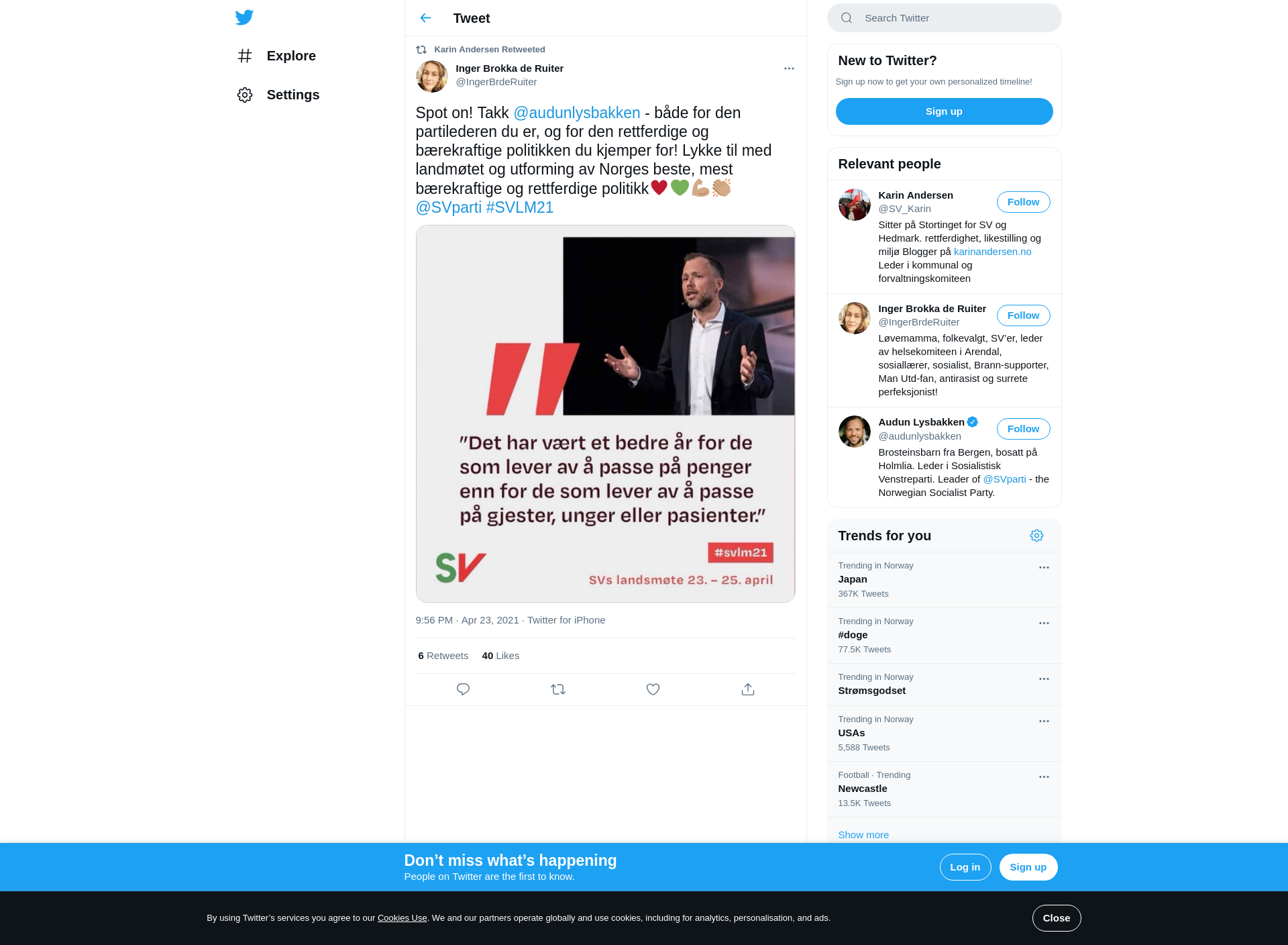 RT @IngerBrdeRuiter: Spot on! Takk @audunlysbakken - både for den partilederen du er, og for den rettferdige og bærekraftige politikken du kjemper for! Lykke til med landmøtet og utforming av Norges beste, mest bærekraftige og rettferdige politikk♥️💚💪🏽👏🏽 @SVparti #SVLM21 https://t.co/cN03ARmlzt