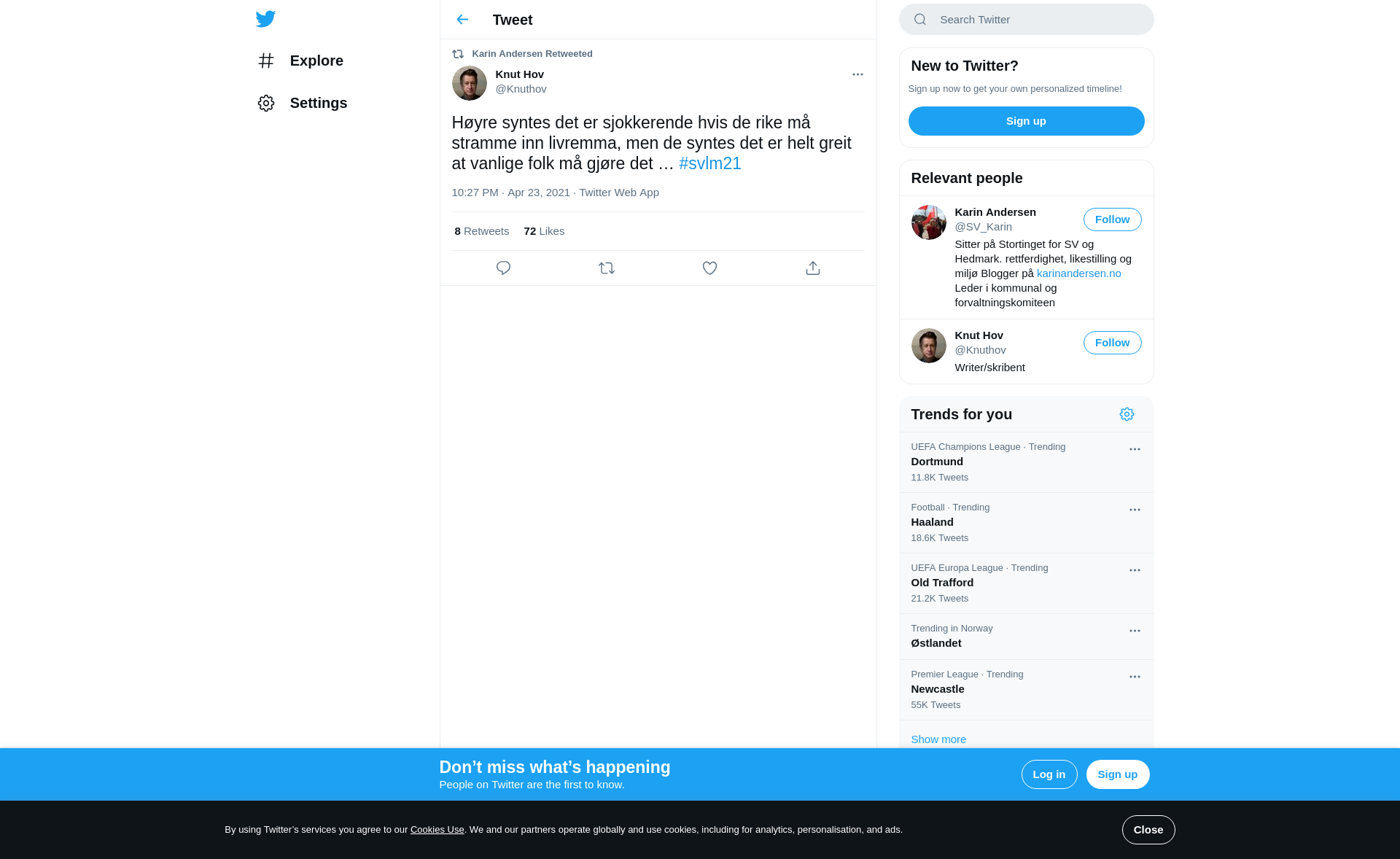 RT @Knuthov: Høyre syntes det er sjokkerende hvis de rike må stramme inn livremma, men de syntes det er helt greit at vanlige folk må gjøre det … #svlm21