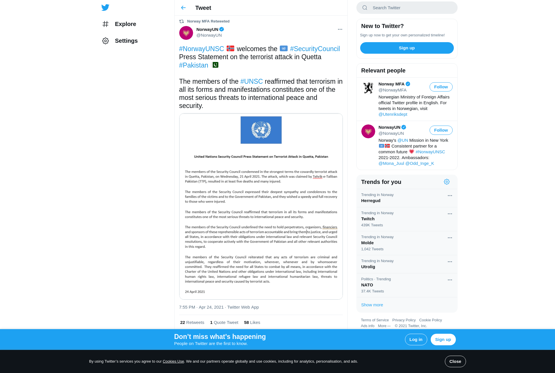 RT @NorwayUN: #NorwayUNSC 🇳🇴 welcomes the 🇺🇳 #SecurityCouncil Press Statement on the terrorist attack in Quetta #Pakistan 🇵🇰 The members o…