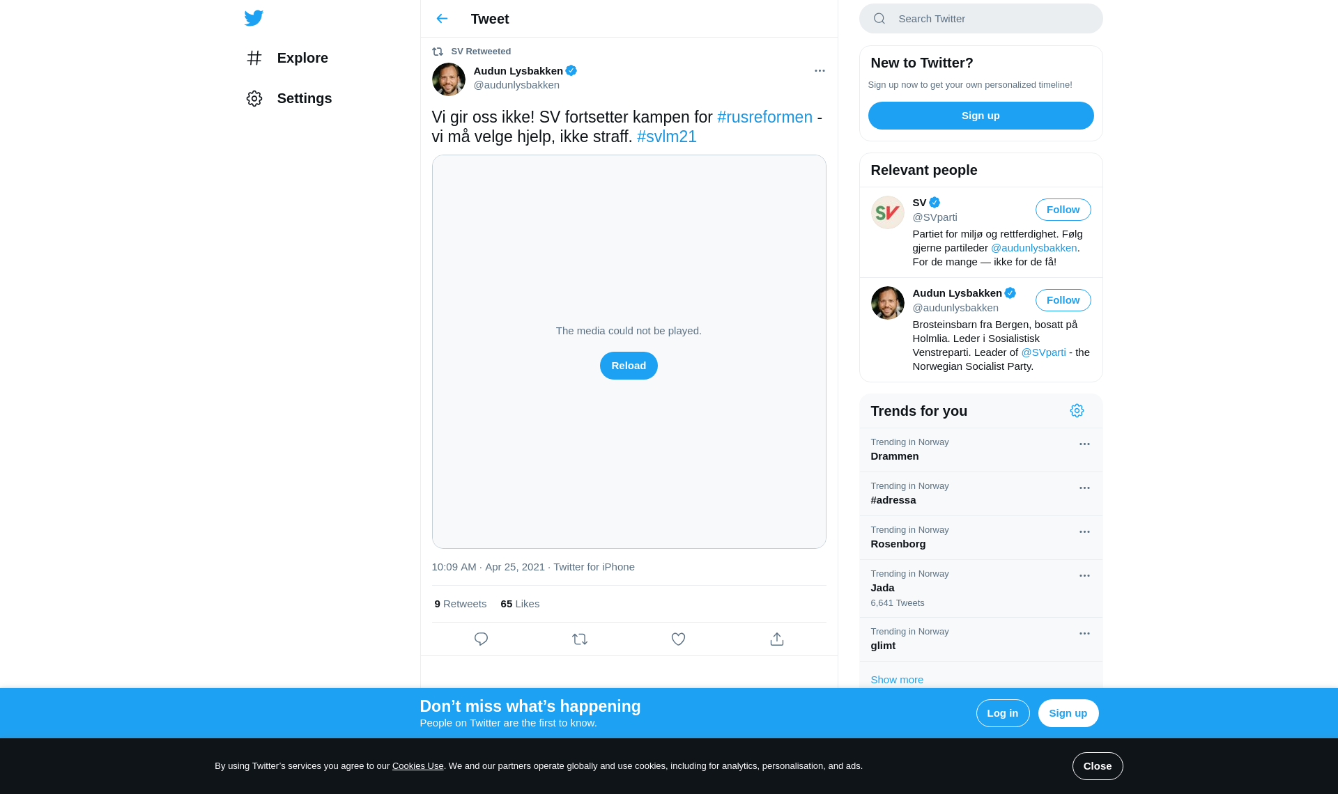 RT @audunlysbakken: Vi gir oss ikke! SV fortsetter kampen for #rusreformen - vi må velge hjelp, ikke straff. #svlm21 https://t.co/7NQjLoUrmX