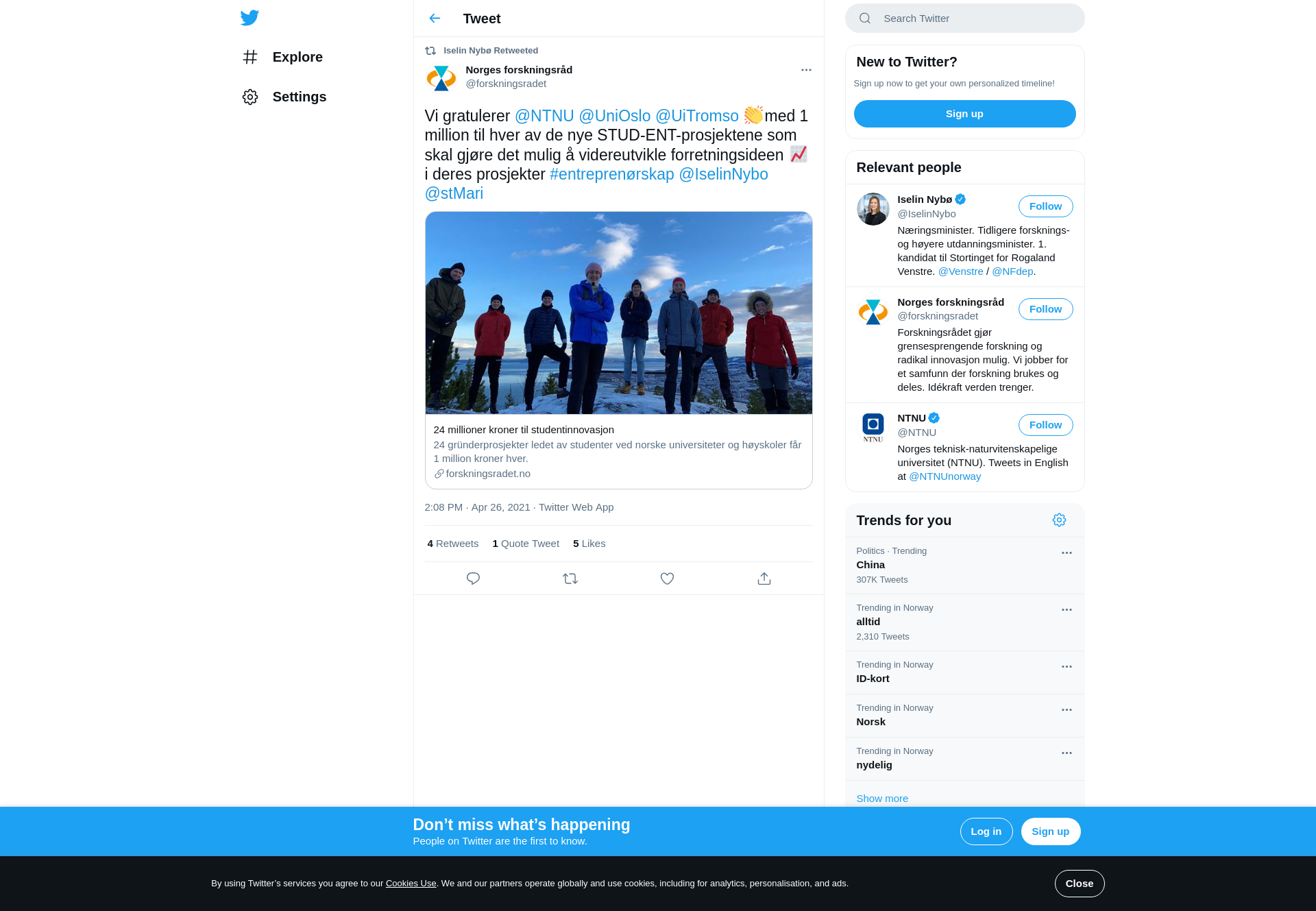 RT @forskningsradet: Vi gratulerer @NTNU @UniOslo @UiTromso 👏med 1 million til hver av de nye STUD-ENT-prosjektene som skal gjøre det mulig å videreutvikle forretningsideen 📈i deres prosjekter #entreprenørskap @IselinNybo @stMari https://t.co/JY3HZJ9ae6