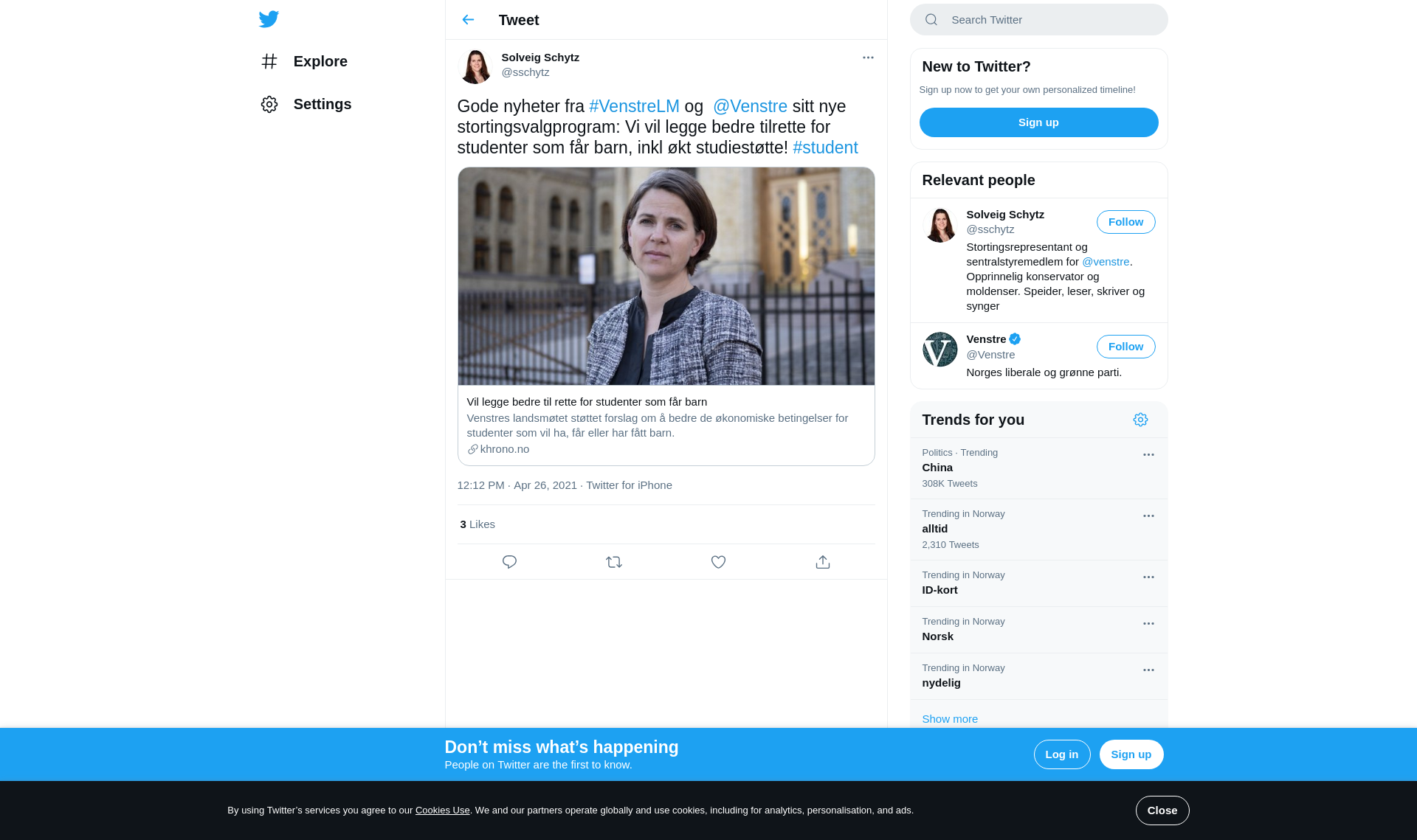 Gode nyheter fra #VenstreLM og @Venstre sitt nye stortingsvalgprogram: Vi vil legge bedre tilrette for studenter som får barn, inkl økt studiestøtte! #student https://t.co/8ZWKlO8q64