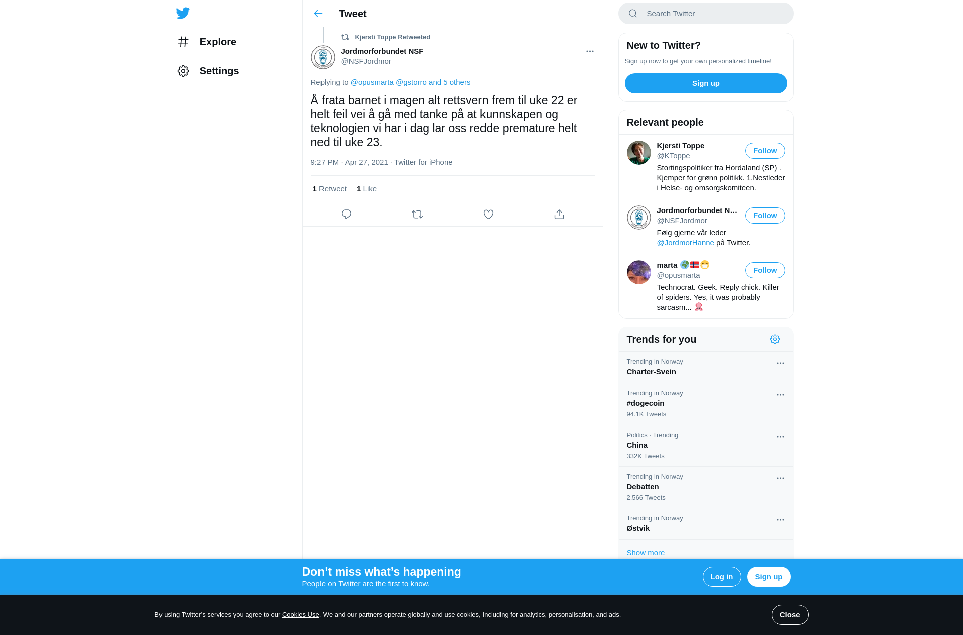 RT @NSFJordmor: @opusmarta @gstorro @JordmorHanne @NickWilki @NSFleder @KToppe @SVparti Å frata barnet i magen alt rettsvern frem til uke 22 er helt feil vei å gå med tanke på at kunnskapen og teknologien vi har i dag lar oss redde premature helt ned til uke 23.