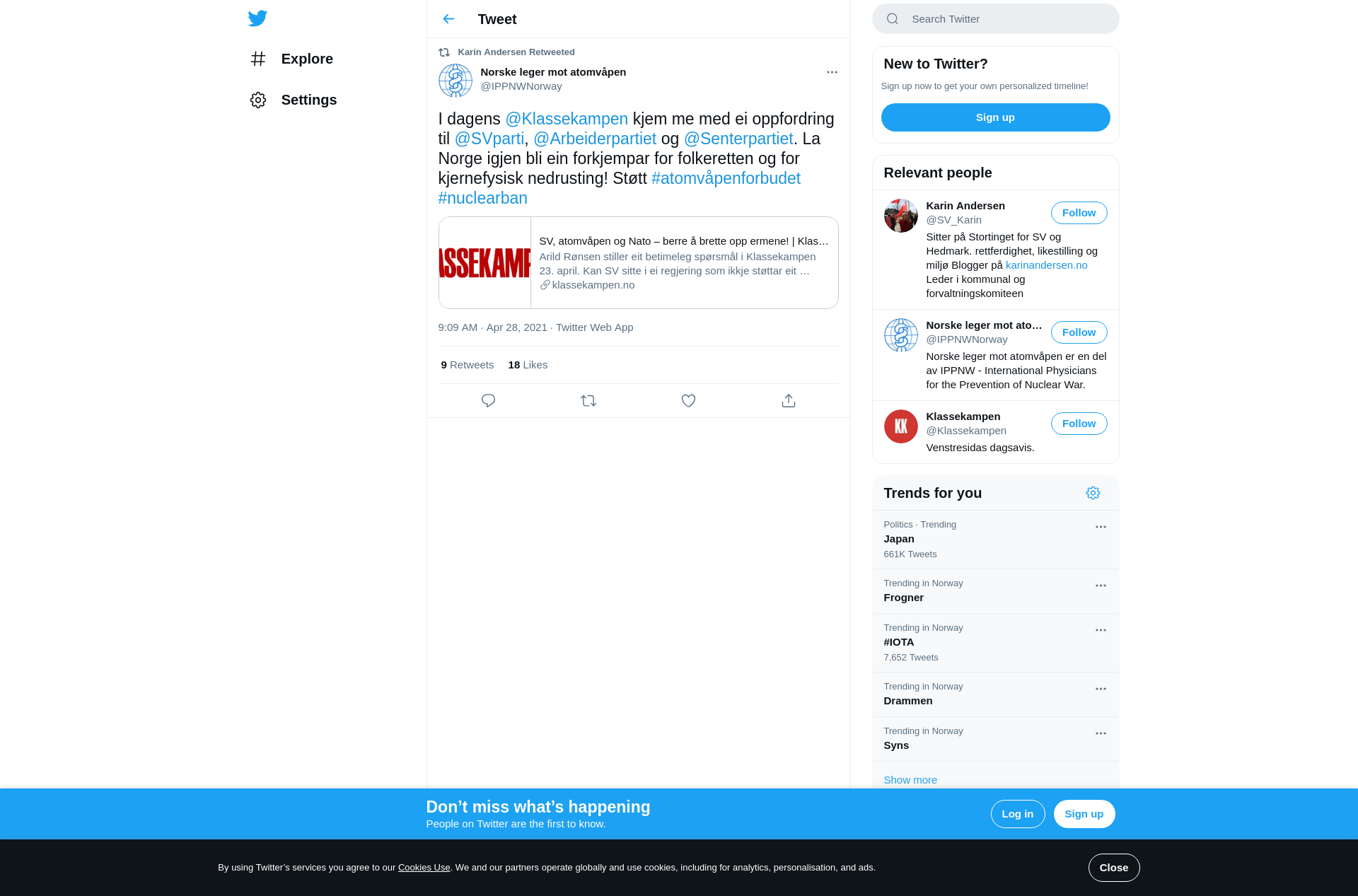 RT @IPPNWNorway: I dagens @Klassekampen kjem me med ei oppfordring til @SVparti, @Arbeiderpartiet og @Senterpartiet. La Norge igjen bli ein forkjempar for folkeretten og for kjernefysisk nedrusting! Støtt #atomvåpenforbudet #nuclearban https://t.co/OxoN0vRF5d