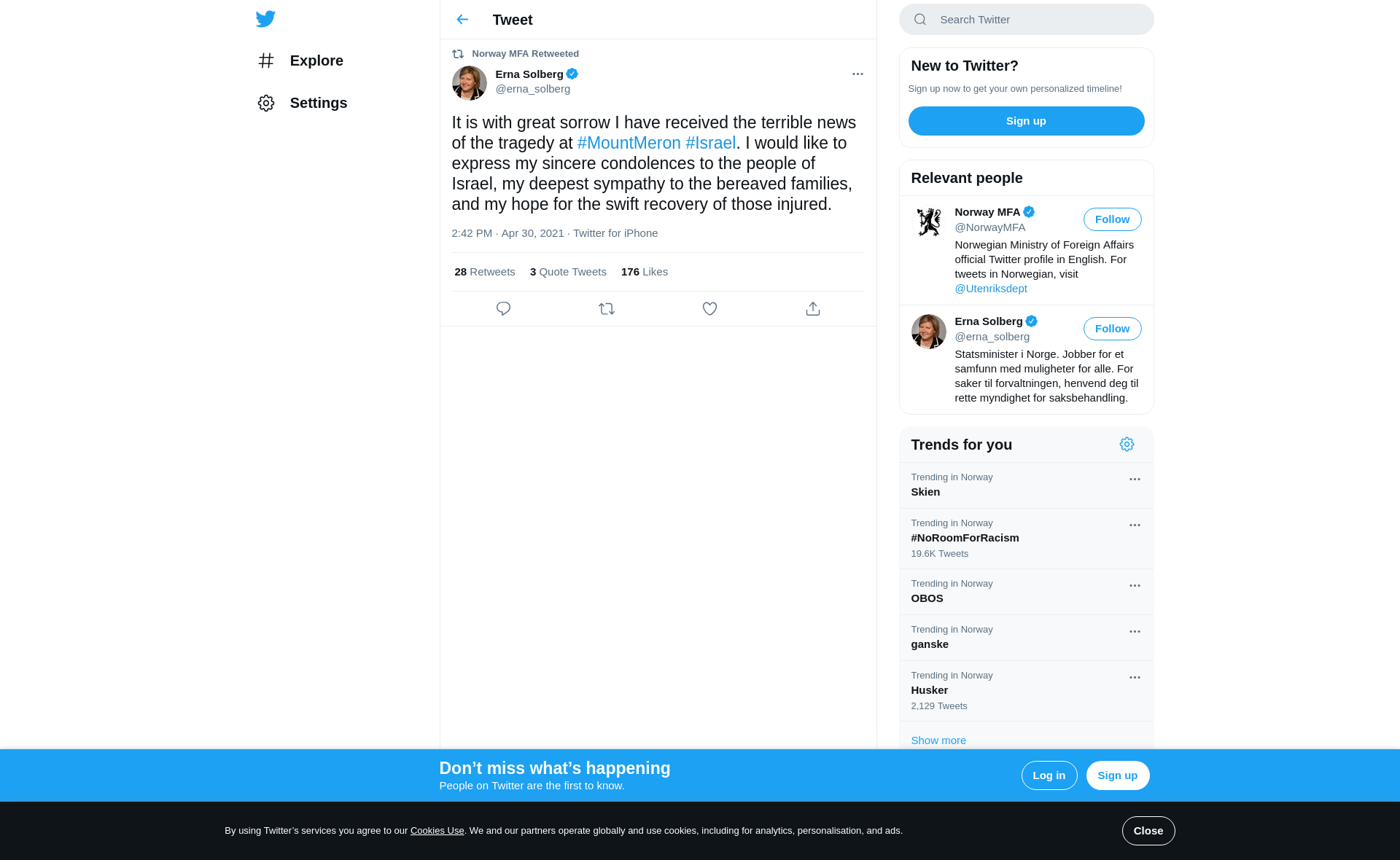 RT @erna_solberg: It is with great sorrow I have received the terrible news of the tragedy at #MountMeron #Israel. I would like to express my sincere condolences to the people of Israel, my deepest sympathy to the bereaved families, and my hope for the swift recovery of those injured.