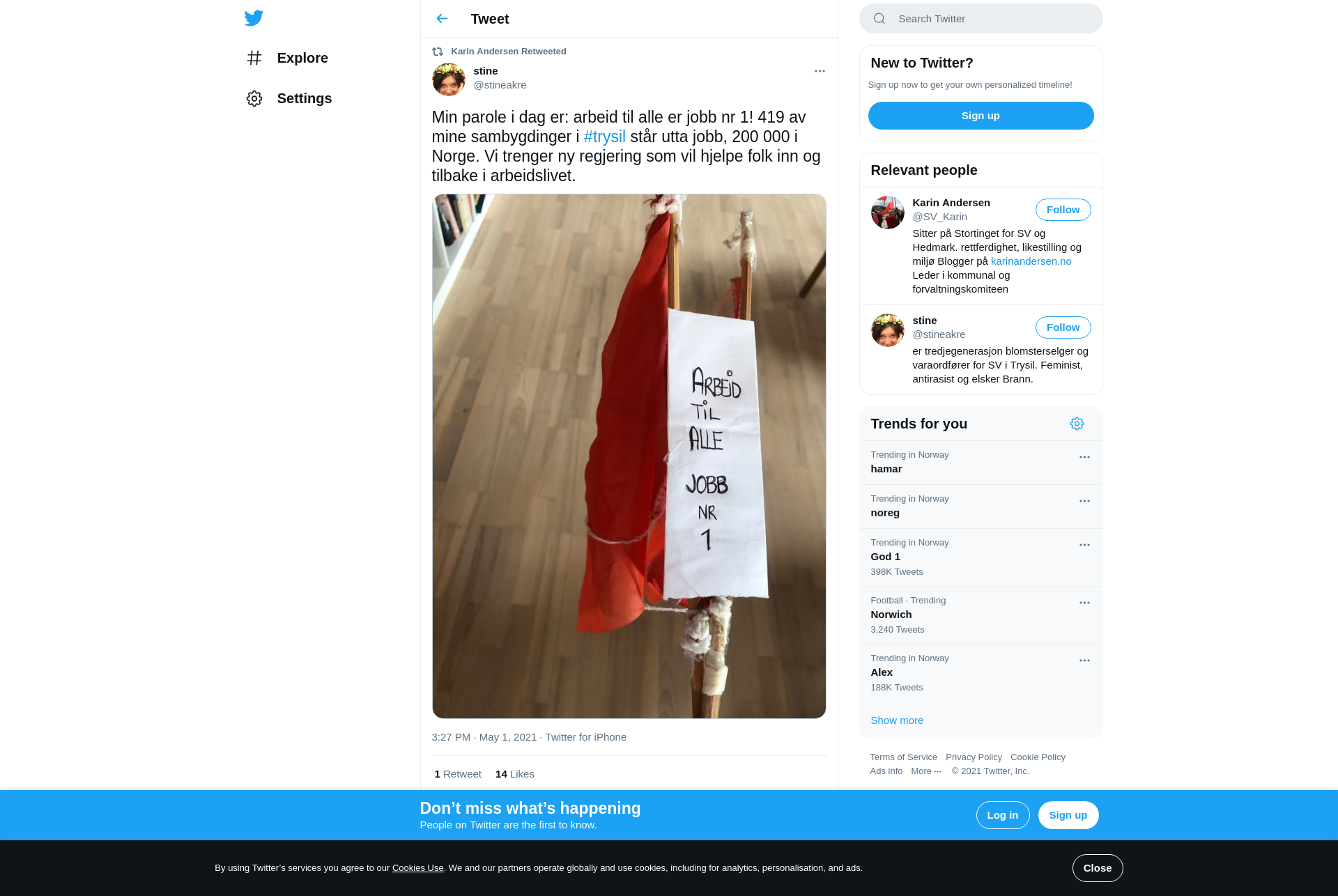 RT @stineakre: Min parole i dag er: arbeid til alle er jobb nr 1! 419 av mine sambygdinger i #trysil står utta jobb, 200 000 i Norge. Vi trenger ny regjering som vil hjelpe folk inn og tilbake i arbeidslivet. https://t.co/8PrSzuwUEf