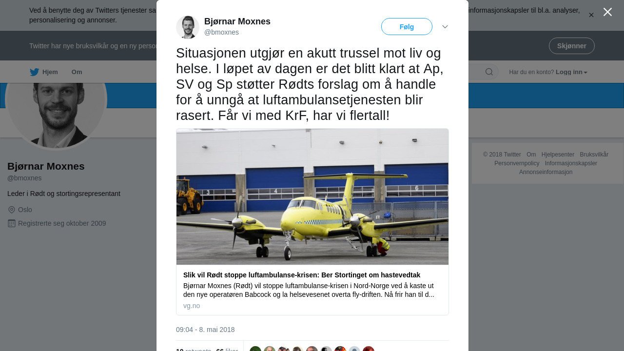 Situasjonen utgjør en akutt trussel mot liv og helse. I løpet av dagen er det blitt klart at Ap, SV og Sp støtter Rødts forslag om å handle for å unngå at luftambulansetjenesten blir rasert. Får vi med KrF, har vi flertall! https://t.co/jL3wu798WR