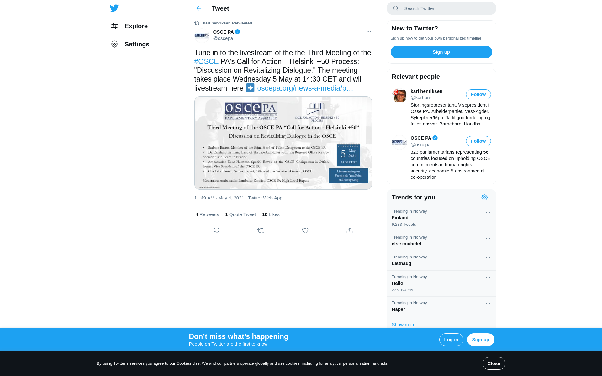 RT @oscepa: Tune in to the livestream of the the Third Meeting of the #OSCE PA's Call for Action – Helsinki +50 Process: "Discussion on Revitalizing Dialogue." The meeting takes place Wednesday 5 May at 14:30 CET and will livestream here ➡️ https://t.co/5GJvUPhs2v https://t.co/ouw03v380j