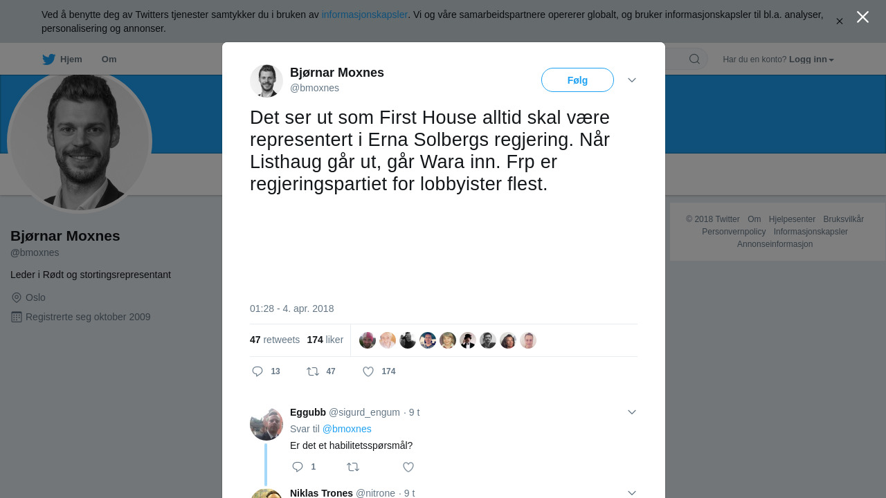 Det ser ut som First House alltid skal være representert i Erna Solbergs regjering. Når Listhaug går ut, går Wara inn. Frp er regjeringspartiet for lobbyister flest. https://t.co/kglbcwTuC1