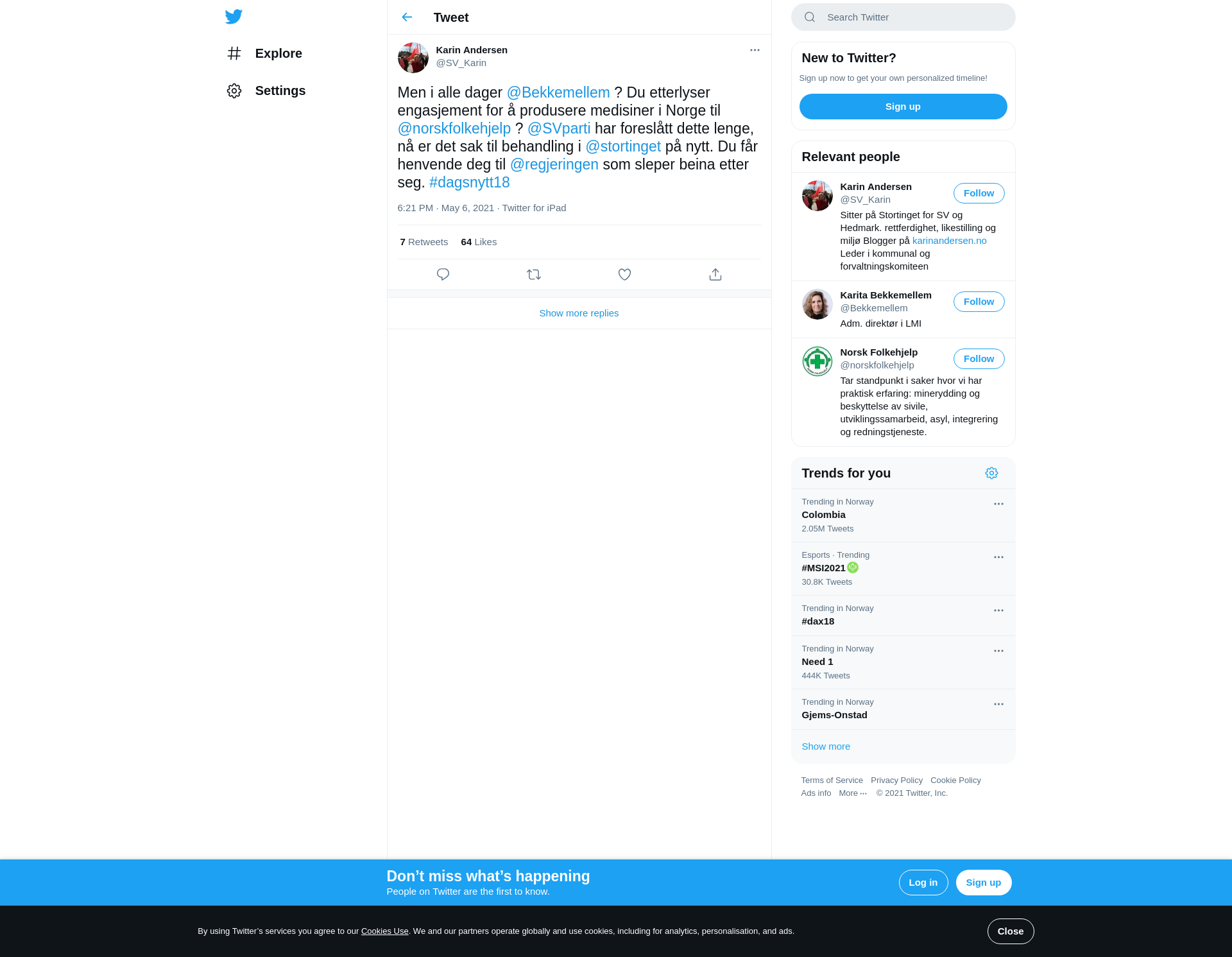 Men i alle dager @Bekkemellem ? Du etterlyser engasjement for å produsere medisiner i Norge til @norskfolkehjelp ? @SVparti har foreslått dette lenge, nå er det sak til behandling i @stortinget på nytt. Du får henvende deg til @regjeringen som sleper beina etter seg. #dagsnytt18