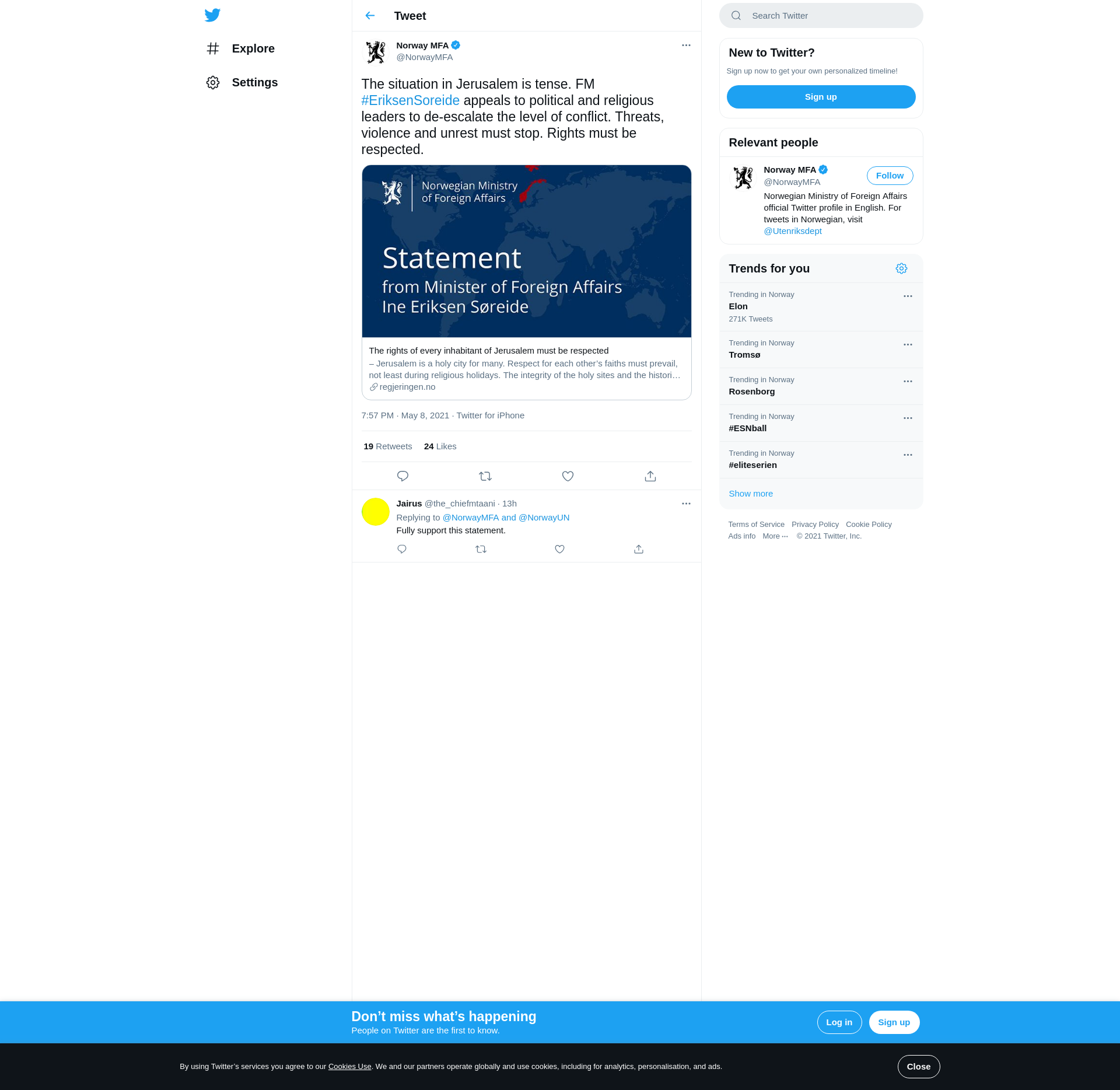 – Jerusalem is a holy city for many. Respect for each other’s faiths must prevail, not least during religious holidays. The integrity of the holy sites and the historic status quo must be upheld and fully respected, says Foreign Minister Ine Eriksen Sø...