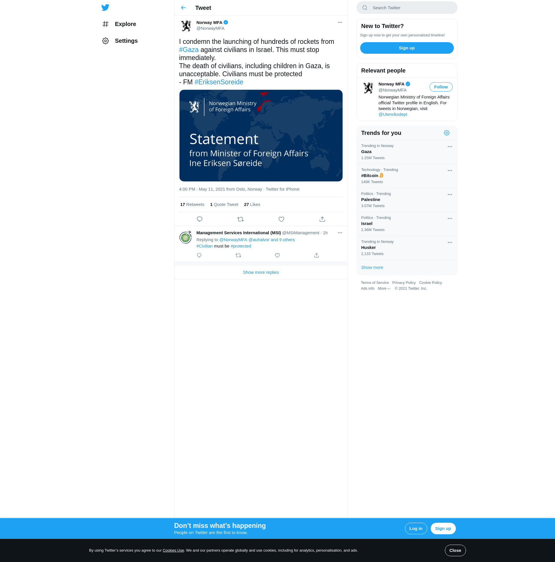 I condemn the launching of hundreds of rockets from #Gaza against civilians in Israel. This must stop immediately.