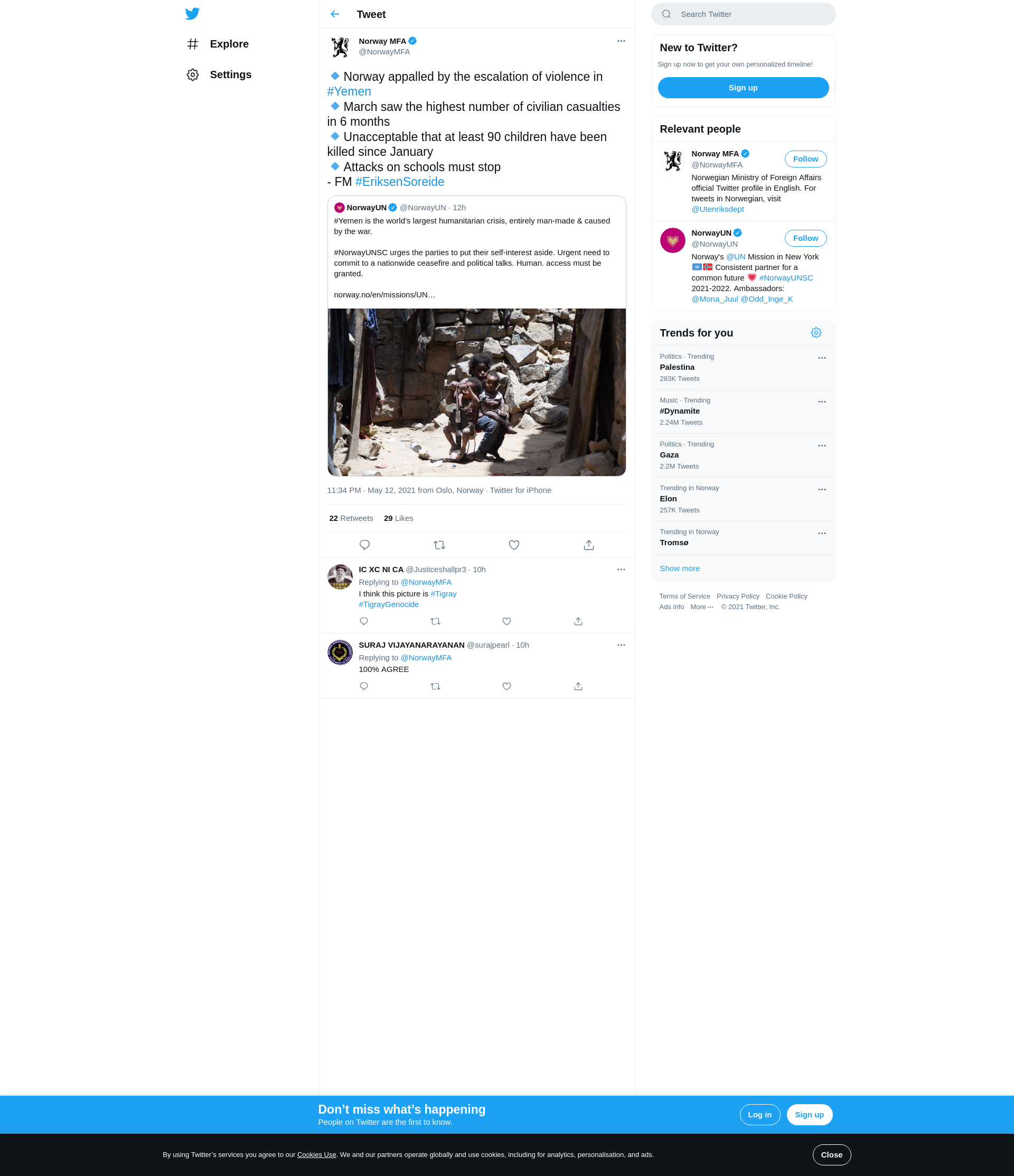 Statement by Permanent Representative Mona Juul on the situation in Yemen, 12 May 2021. I want to thank SRSG Martin Griffiths and USG Mark Lowcock for their briefings. Moreover, I would like to wish Muslims in Yemen and around the world Eid Mubarak. Norway welcomes the international community’s increased efforts to achieve progress in Yemen, and would like to thank you Martin, as well as US Envoy Lenderking, Oman and other regional actors, including Saudi-Arabia. We are encouraged by news of recent
