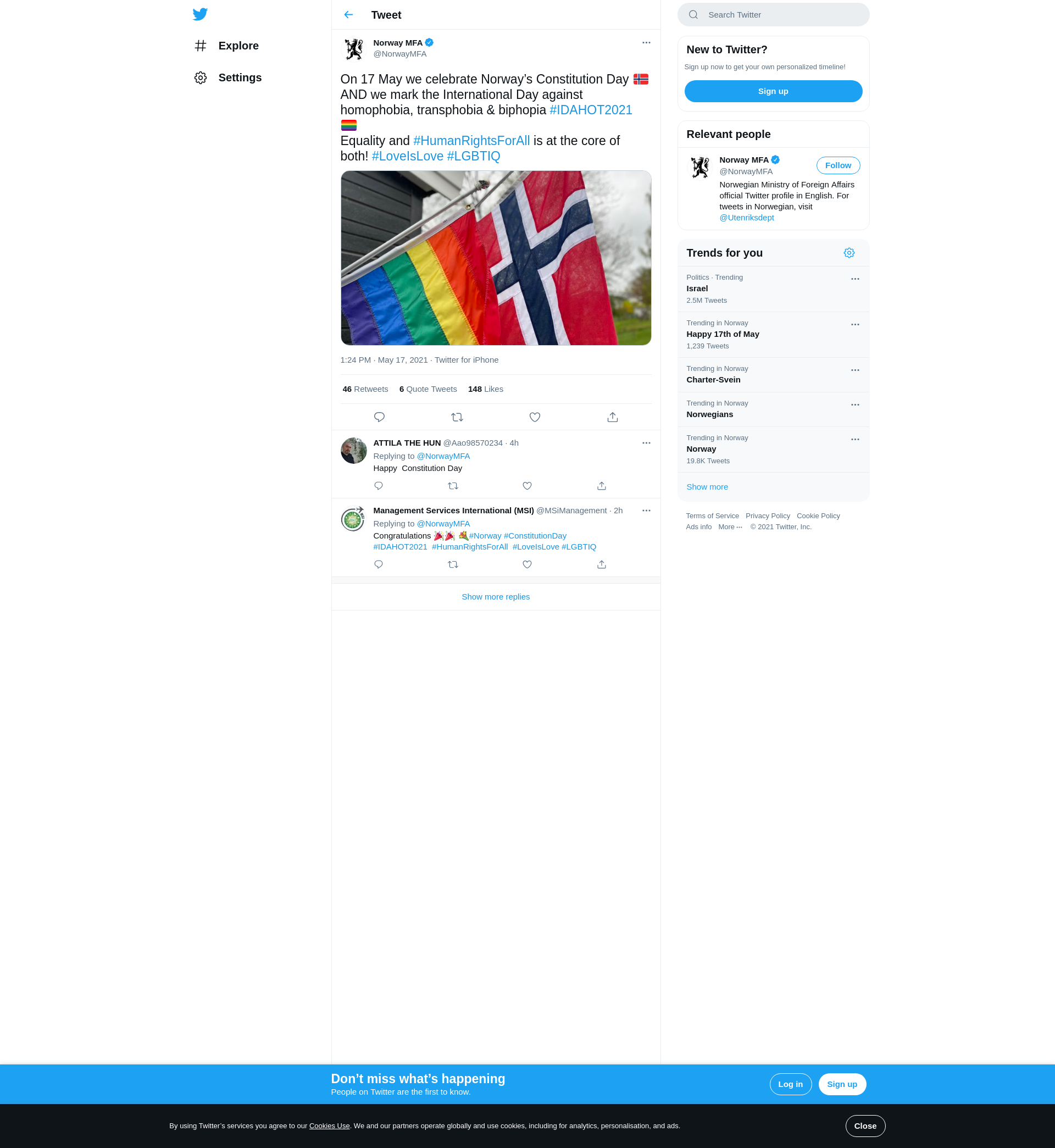 On 17 May we celebrate Norway’s Constitution Day 🇳🇴 AND we mark the International Day against homophobia, transphobia & biphopia #IDAHOT2021 🏳️🌈