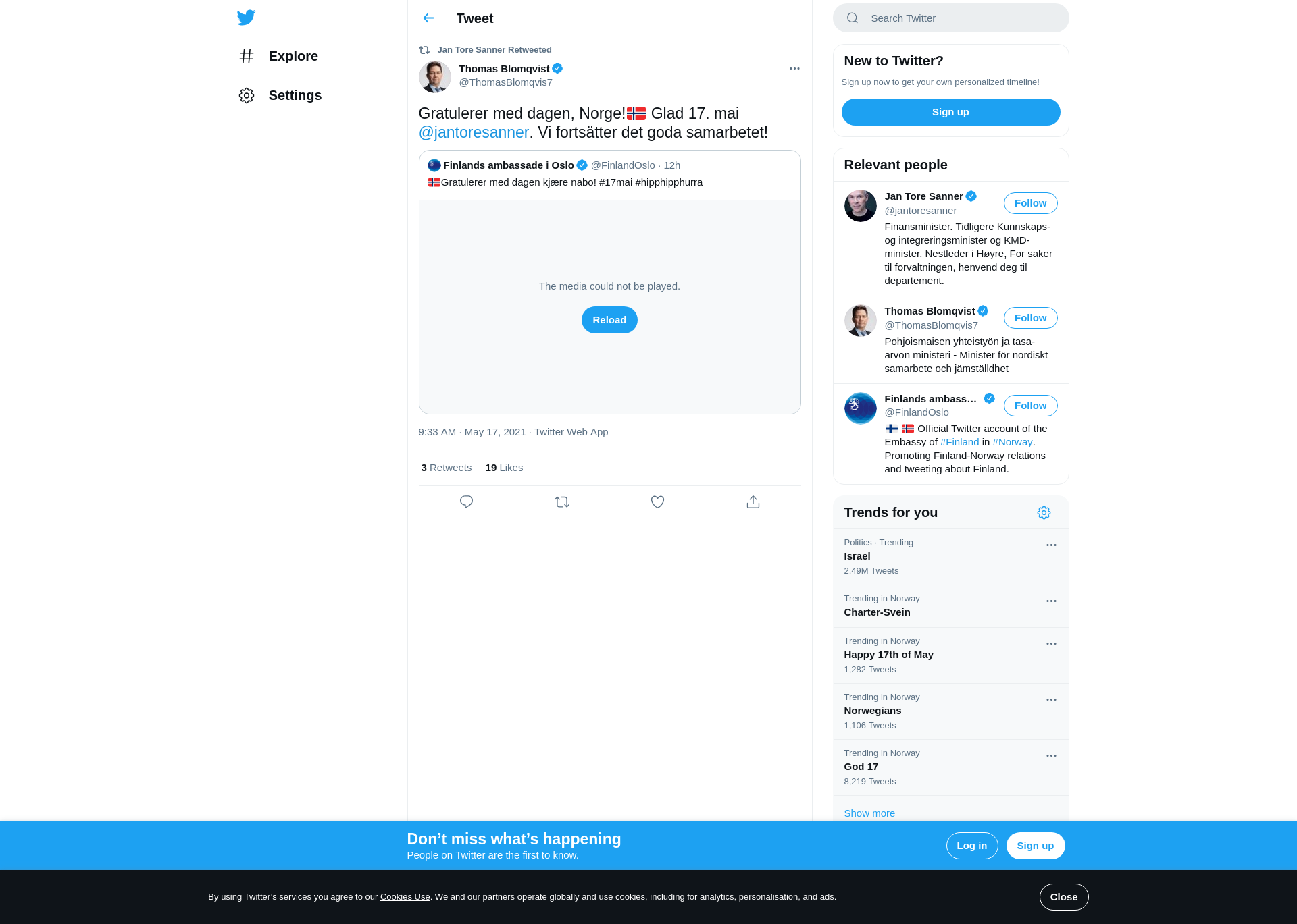 RT @ThomasBlomqvis7: Gratulerer med dagen, Norge!🇳🇴 Glad 17. mai @jantoresanner. Vi fortsätter det goda samarbetet!