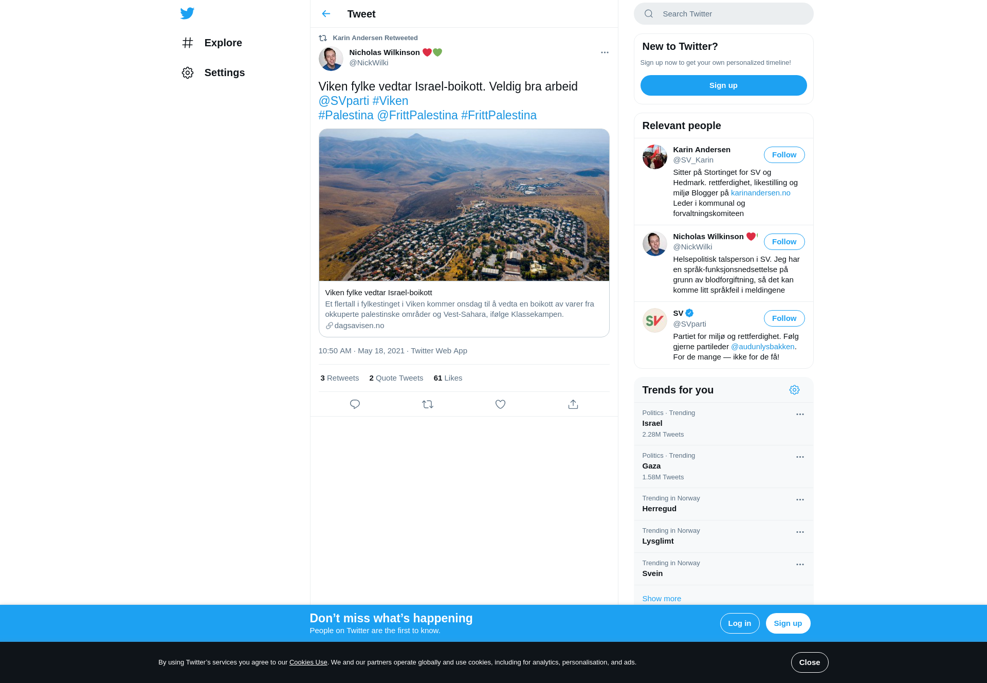 RT @NickWilki: Viken fylke vedtar Israel-boikott. Veldig bra arbeid @SVparti #Viken #Palestina @FrittPalestina #FrittPalestina https://t.c…