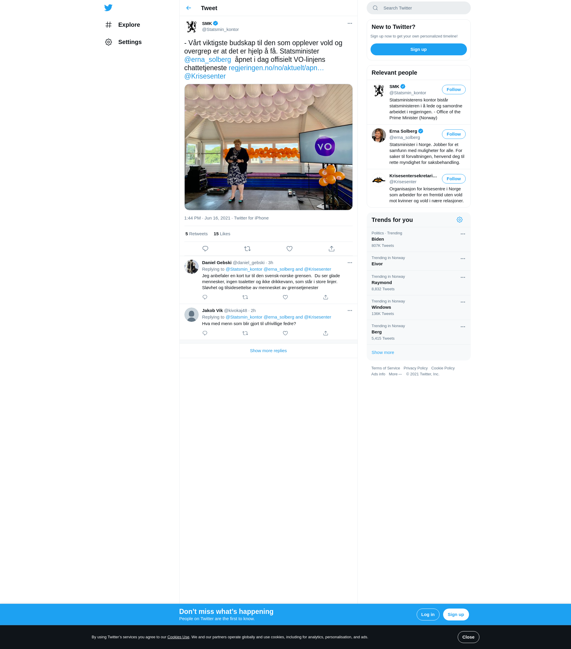 - Vårt viktigste budskap til den som opplever vold og overgrep er at det er hjelp å få. Statsminister @erna_solberg åpnet i dag offisielt VO-linjens chattetjeneste https://t.co/33zH1QnYrw @Krisesenter https://t.co/YIbePCnYDn