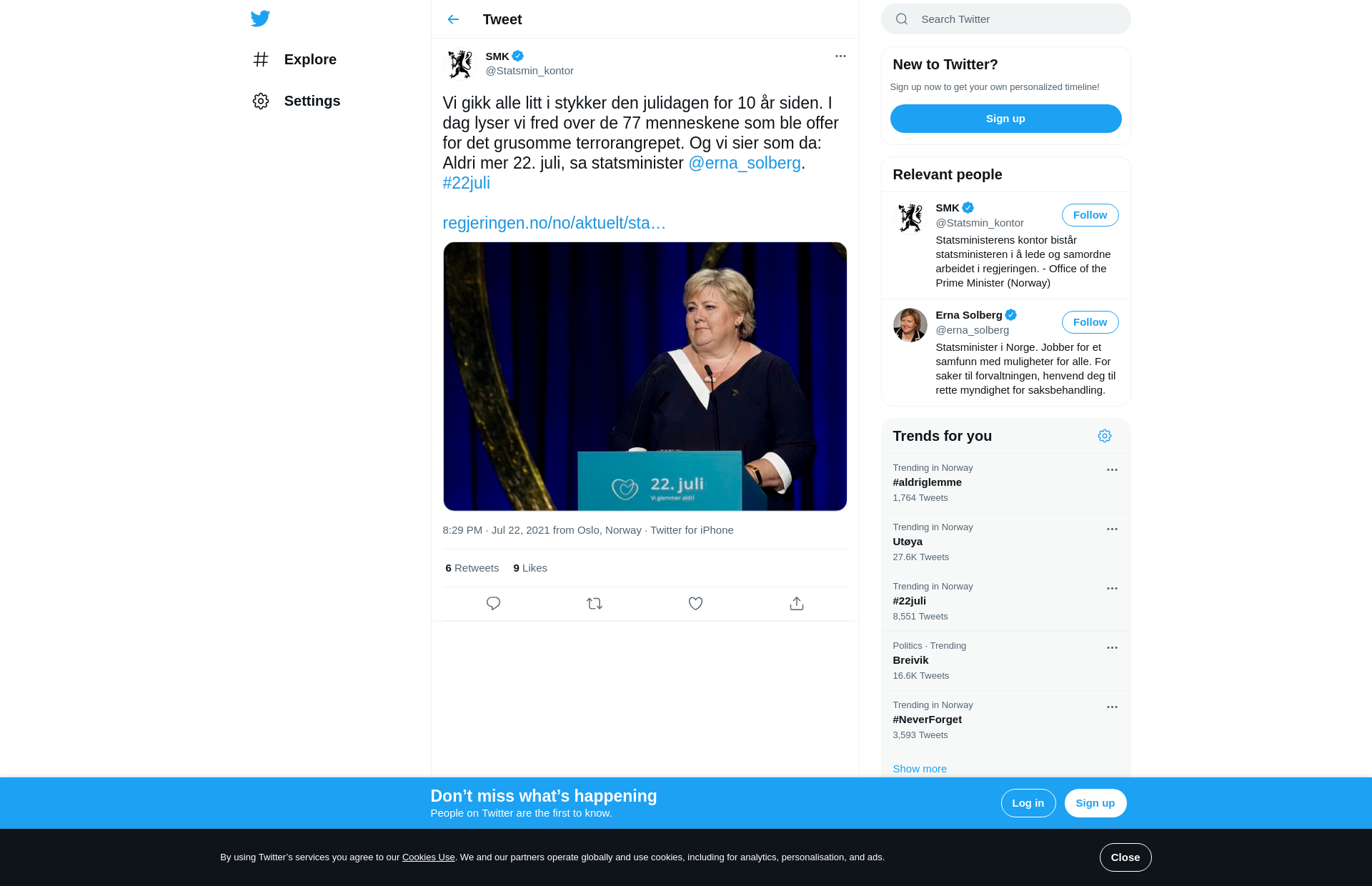 Vi gikk alle litt i stykker den julidagen for 10 år siden. I dag lyser vi fred over de 77 menneskene som ble offer for det grusomme terrorangrepet. Og vi sier som da: Aldri mer 22. juli, sa statsminister @erna_solberg. #22juli