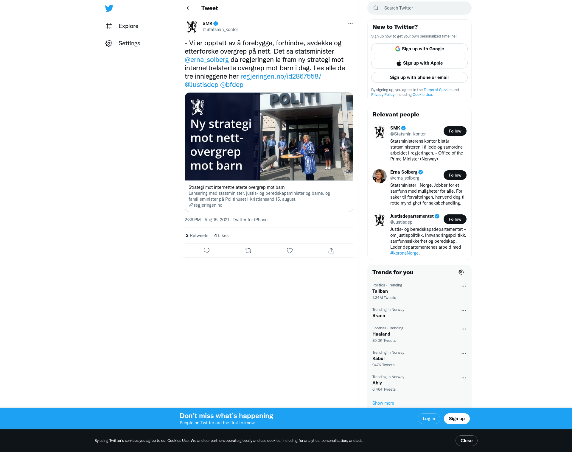 - Vi er opptatt av å forebygge, forhindre, avdekke og etterforske overgrep på nett. Det sa statsminister @erna_solberg da regjeringen la fram ny strategi mot internettrelaterte overgrep mot barn i dag. Les alle de tre innleggene her https://t.co/OogmzUxjKo @Justisdep @bfdep