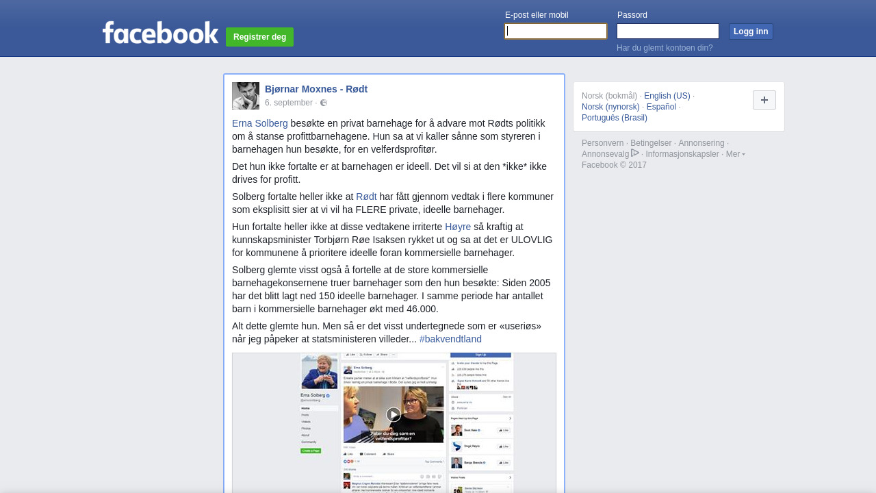 Da statsminister Erna Solberg (H) besøkte en privat, ideell barnehage i Bodø, skrev hun at daglig leder blir fremstilt som velferdsprofitør av enkelte partier. – Løgn, sier Rødts Bjørnar Moxnes.