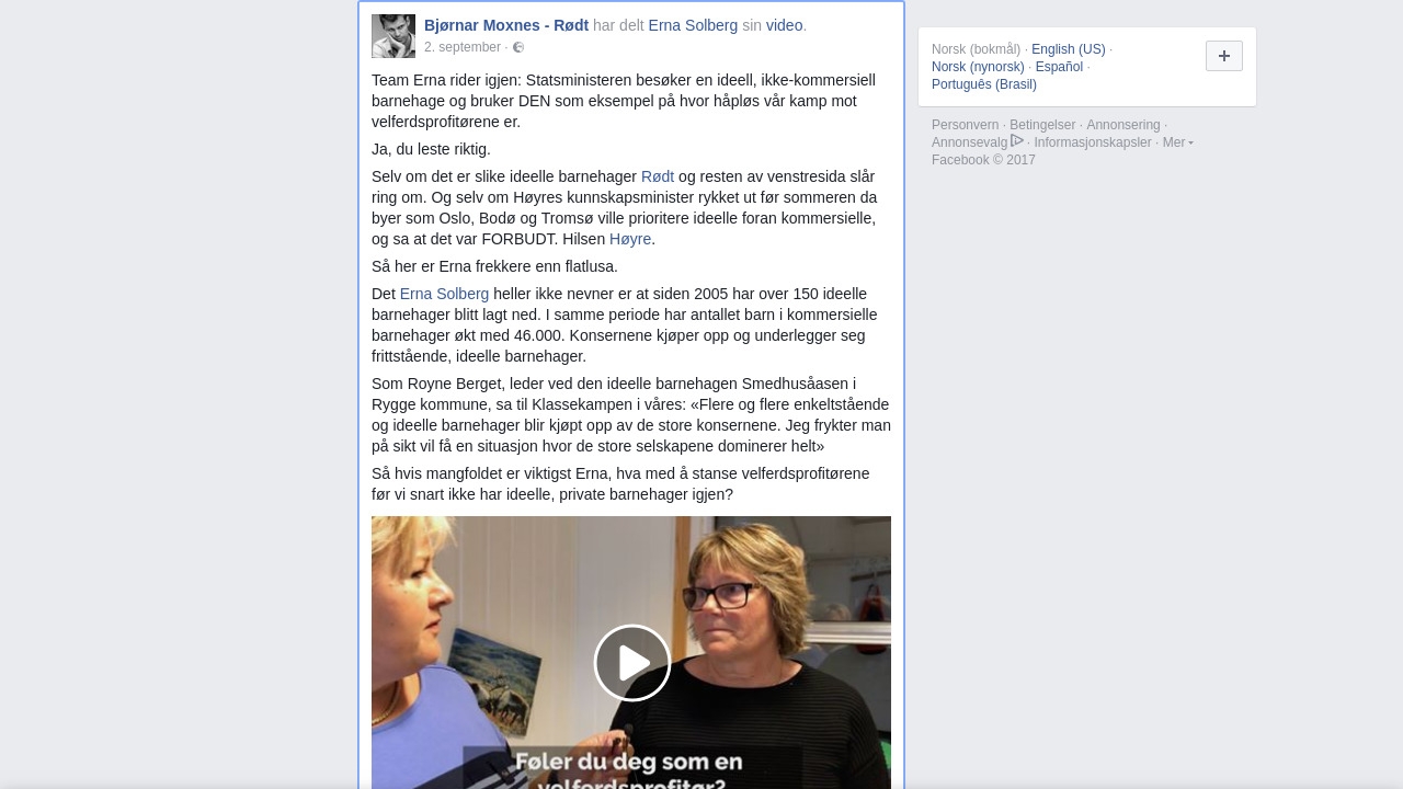 Selv om det er slike ideelle barnehager Rødt og resten av venstresida slår ring om. Og selv om Høyres kunnskapsminister rykket ut før sommeren da byer som Oslo, Bodø og Tromsø ville prioritere ideelle foran kommersielle, og sa at det var FORBUDT. Hilsen Høyre.