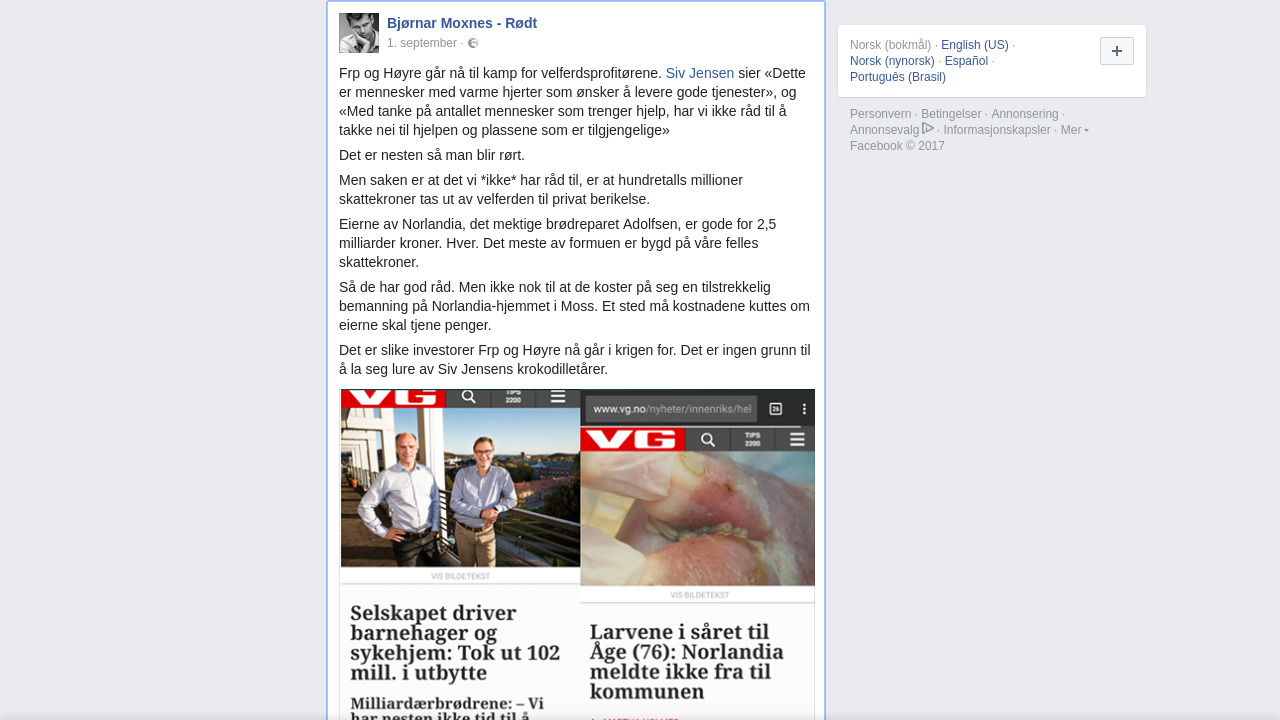 Frp og Høyre går nå til kamp for velferdsprofitørene. Siv Jensen sier «Dette er mennesker med varme hjerter som ønsker å levere gode tjenester», og «Med tanke på antallet mennesker som trenger hjelp, har vi ikke råd til å takke nei til hjelpen og plassene som er tilgjengelige»