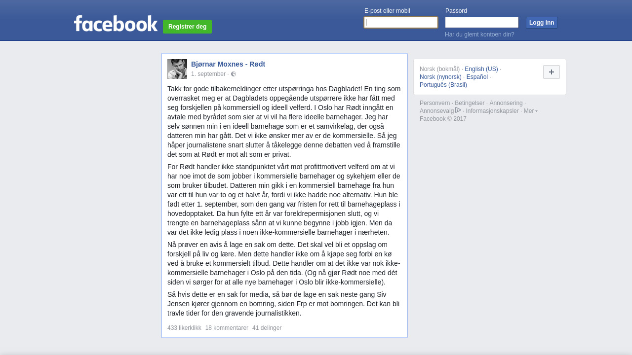 Takk for gode tilbakemeldinger etter utspørringa hos Dagbladet! En ting som overrasket meg er at Dagbladets oppegående utspørrere ikke har fått med seg forskjellen på kommersiell og ideell velferd. I Oslo har Rødt inngått en avtale med byrådet som sier at vi vil ha flere ideelle barnehager. Jeg har selv sønnen min i en ideell barnehage som er et samvirkelag, der også datteren min har gått. Det vi ikke ønsker mer av er de kommersielle. Så jeg håper journalistene snart slutter å tåkelegge denne debatten ved å framstille det som at Rødt er mot alt som er privat.