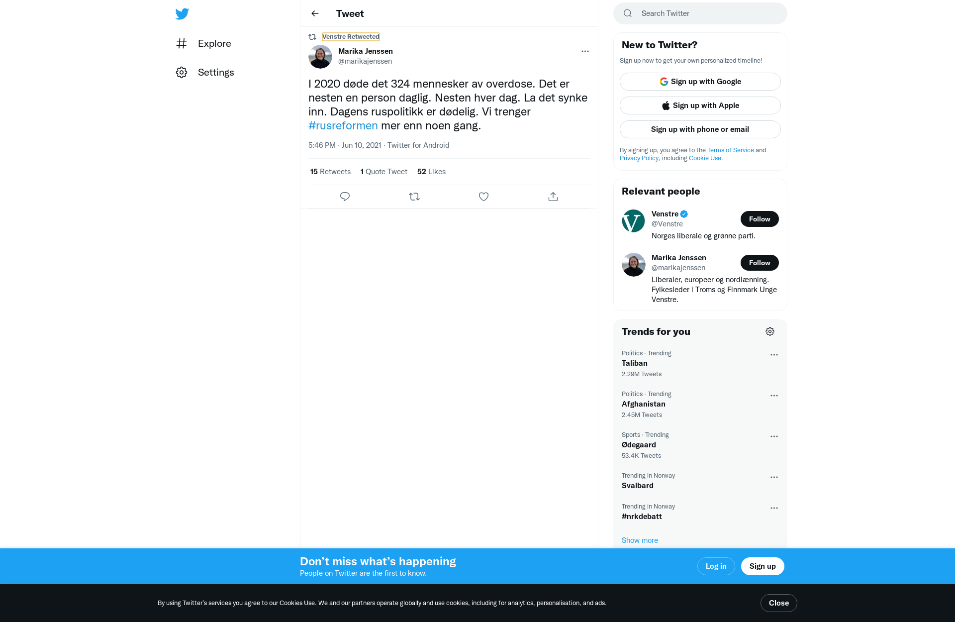RT @marikajenssen: I 2020 døde det 324 mennesker av overdose. Det er nesten en person daglig. Nesten hver dag. La det synke inn. Dagens ruspolitikk er dødelig. Vi trenger #rusreformen mer enn noen gang.