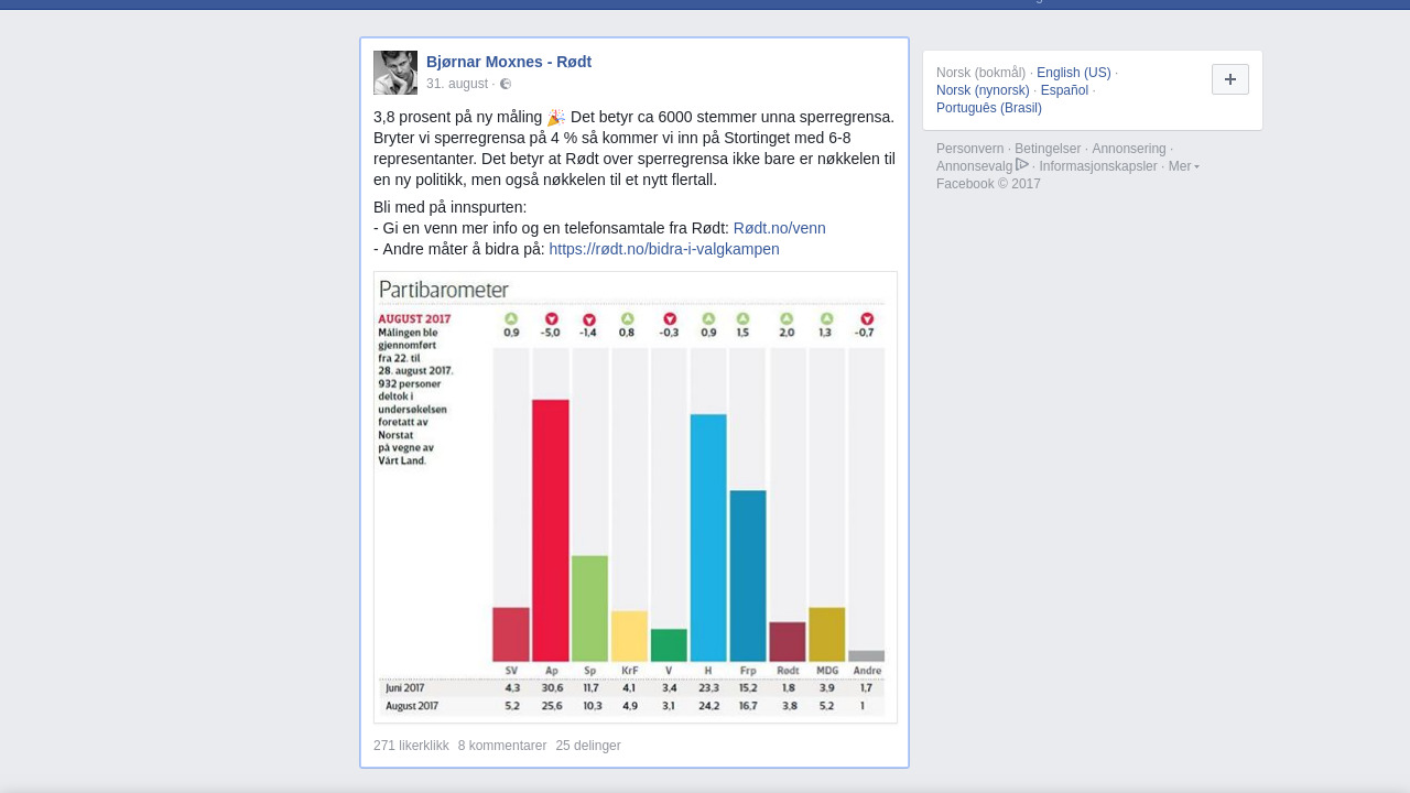 3,8 prosent på ny måling 🎉 Det betyr ca 6000 stemmer unna sperregrensa. Bryter vi sperregrensa på 4 % så kommer vi inn på Stortinget med 6-8 representanter. Det betyr at Rødt over sperregrensa ikke bare er nøkkelen til en ny politikk, men også nøkkelen til et nytt flertall.